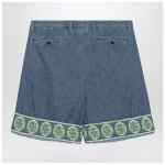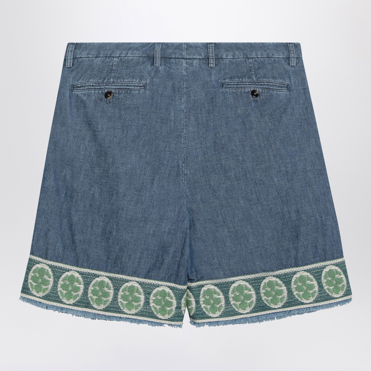 Bermuda by Valentino in blue cotton denim, characterized by two side welt pockets, two back welt pockets with button, bottom with jacquard embroidery, front closure with zip and button, and belt loops.