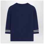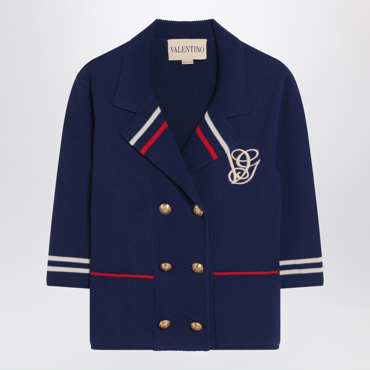 Valentino cardigan in blue virgin wool, featuring a classic jacket-style lapel, contrasting ivory and red details, three-quarter sleeves, front closure with branded golden buttons, ribbed design, two front patch pockets, and contrasting logo embroidery on the chest.