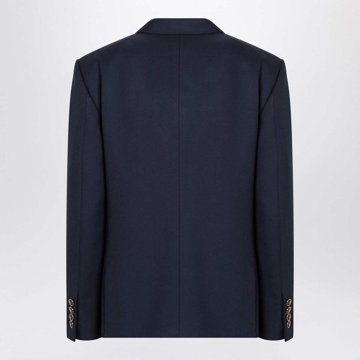Single-breasted jacket by Valentino in blue virgin wool, characterized by a front closure with logoed buttons, three applied pockets on the front, and long sleeves with buttoned cuffs.