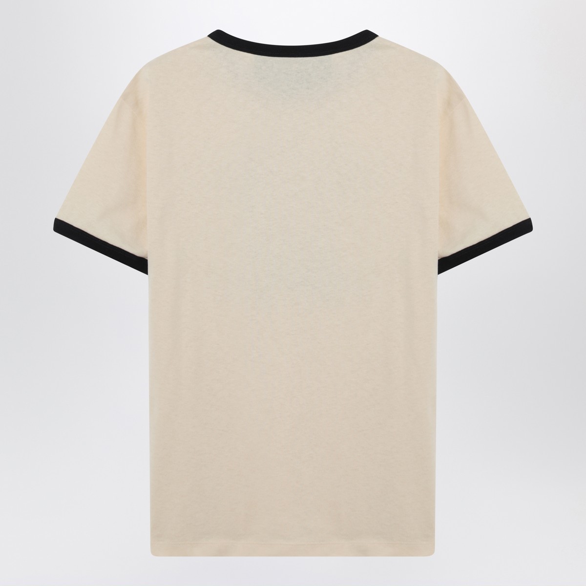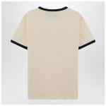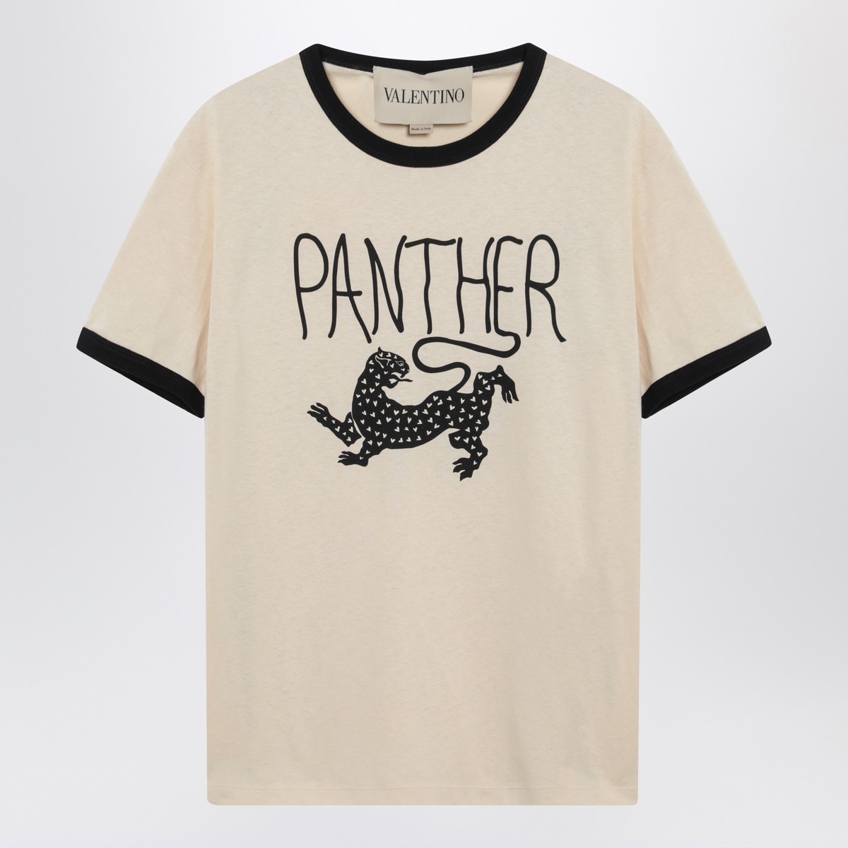 Butter-colored cotton T-shirt by Valentino, featuring ribbed crew neck, short sleeves, contrasting Panther print on the front, and contrasting trims.