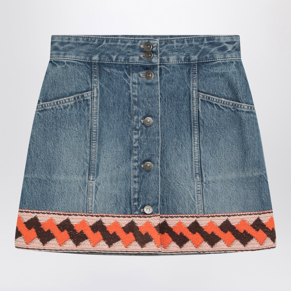 Valentino mini skirt in faded blue cotton denim, characterized by a high waist, front button closure, two side pockets, and contrasting jacquard trim.