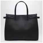 Valentino Garavani medium tote bag in black leather, featuring two leather handles, an adjustable and removable shoulder strap, side buckles, and a leather patch with a metal Vlog Signature plate in gold finish, magnetic closure, and an internal flat pocket with zip.