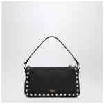 Small shoulder bag by Valentino Garavani in black calf leather, featuring decorative metal studded trim, leather handle, adjustable and removable shoulder strap, zip and hook fastening, internal card pocket and logo print on the back.