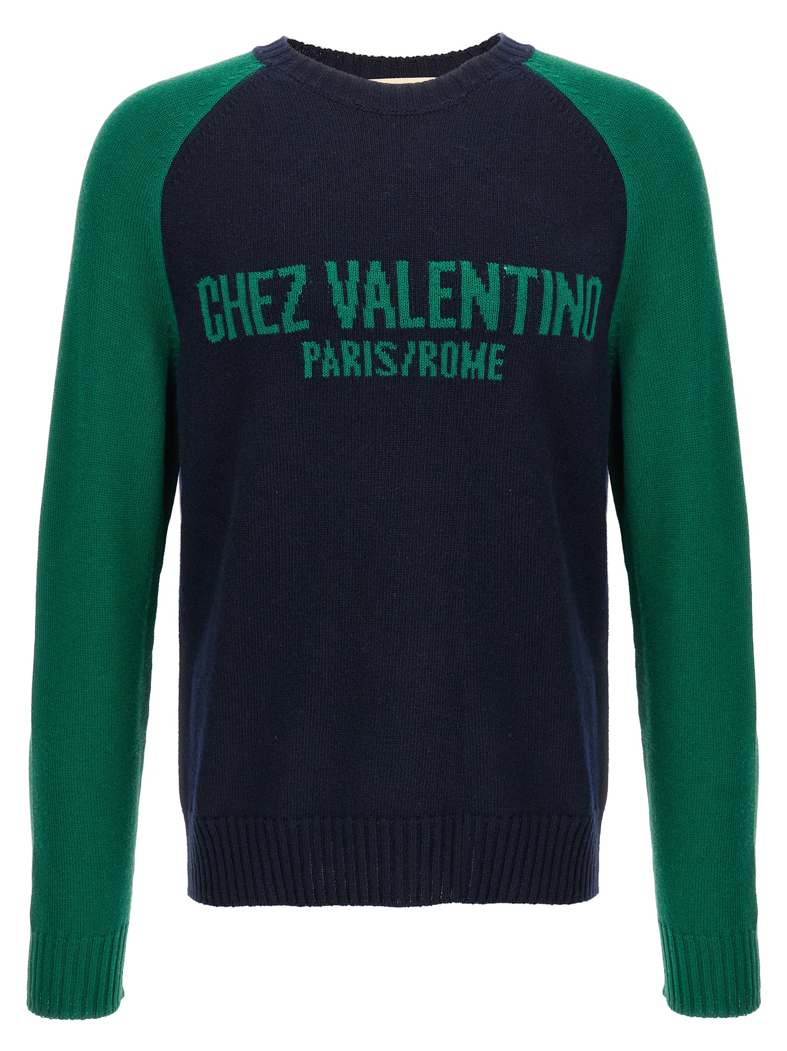 Wool and cotton blend sweater 14 fineness with front jacquard ‘Chez Valentino’ pattern and contrast details, crew neck, long cuffed sleeves.