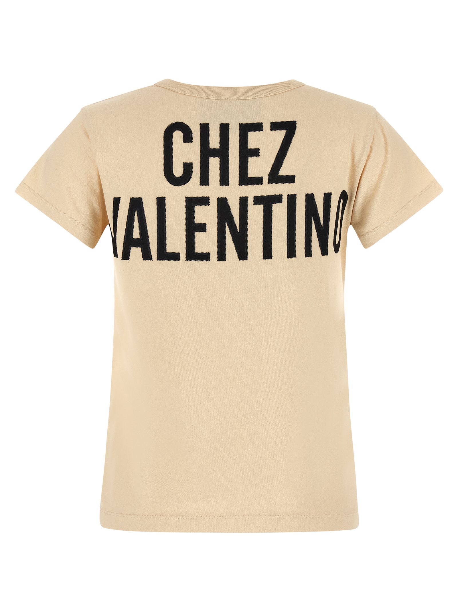 Cotton, crewneck t-shirt, with front print and ‘Chez Valentino’ back patch, short sleeves.