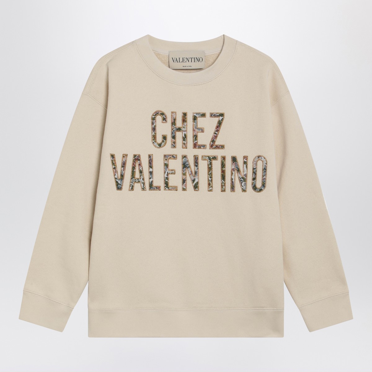 Valentino Garavani ivory cotton crew-neck sweatshirt, featuring Chez Valentino embroidery on the front with floral print, long sleeves, ribbed cuffs and hem.