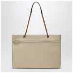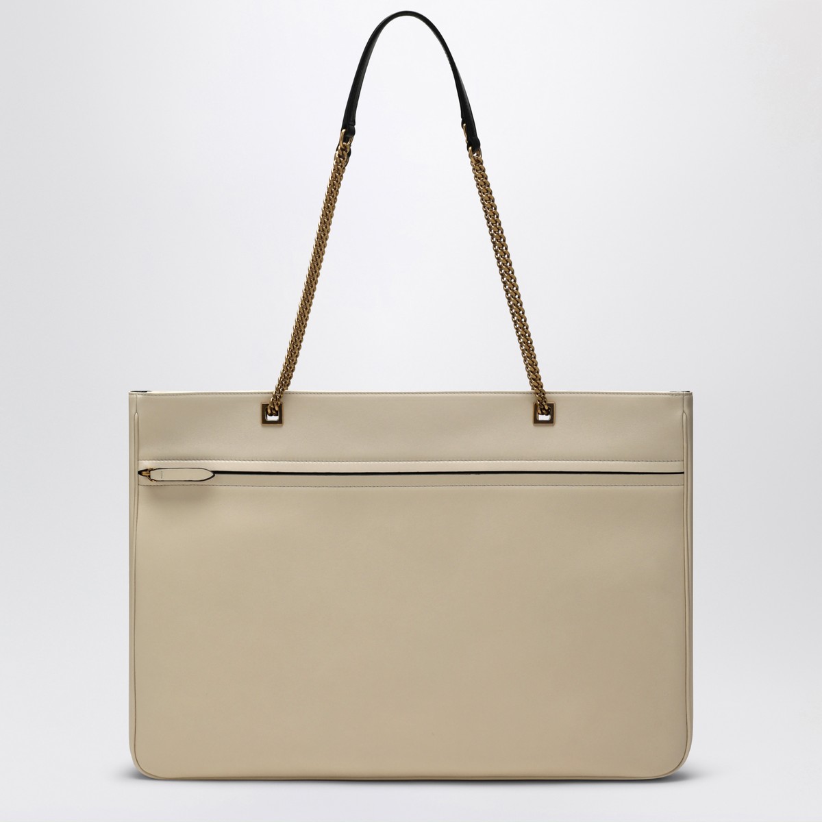 Large handbag by Valentino Garavani in butter-coloured lambskin, characterized by a contrasting black maxi VLogo Signature on the front, sliding chain, antique gold metal hardware, zip closure, and a flat pocket with zip.