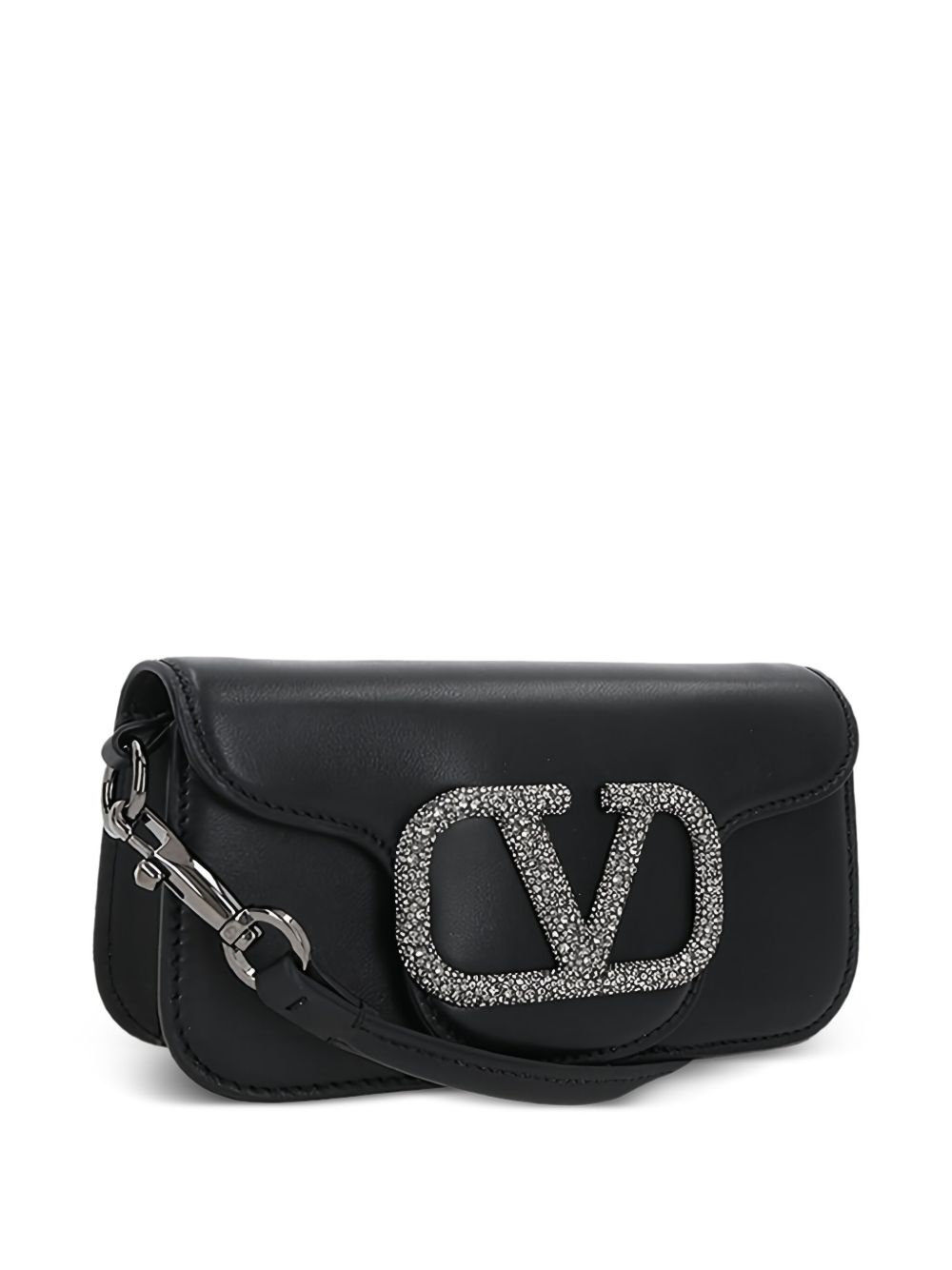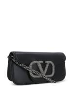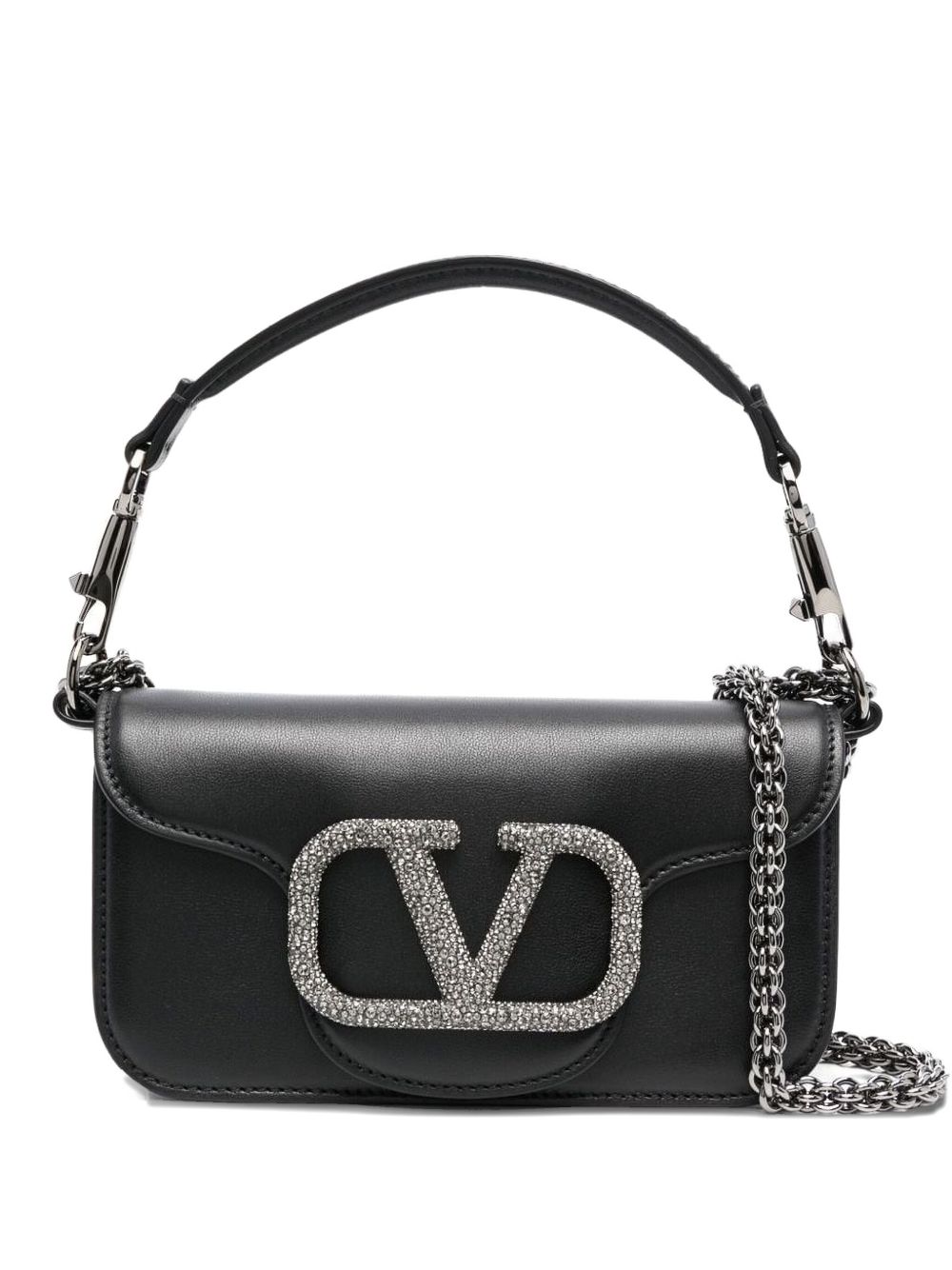 Valentino bag black calf leather Swarovski crystal-embellished maxi VLogo Signature leather and chain-link shoulder strap foldover top with magnetic fastening main compartment internal slip pocket The full look includes Valentino Garavani accessories. Locò small leather shoulder bag. Size and Fit – DEPTH 5 cm. HEIGHT 11 cm. WIDTH 20 cm.