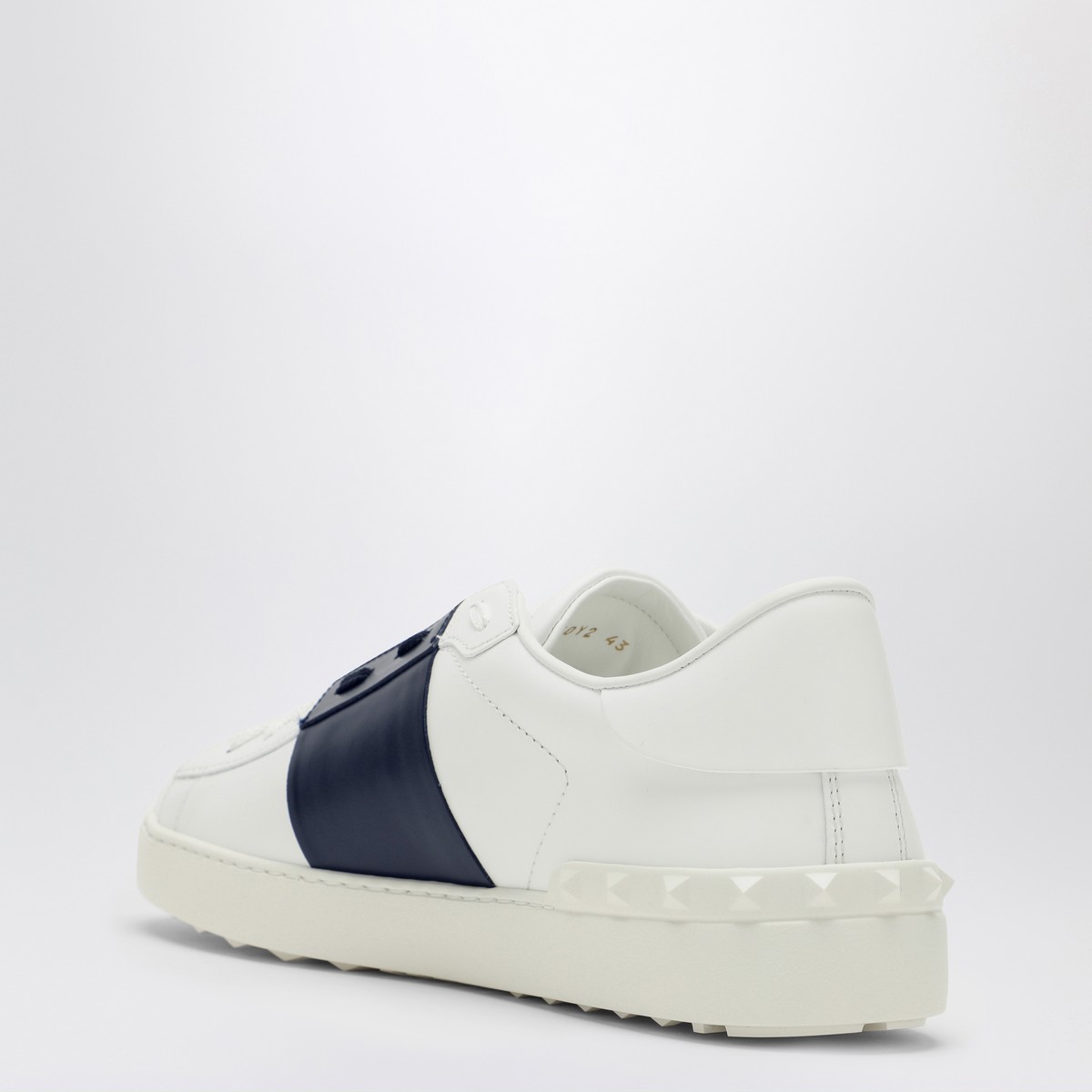 Valentino Garavani sneakers in white calfskin, characterized by a contrasting colour band, rounded toe, lace-up closure, decorative studs, and rubber sole.