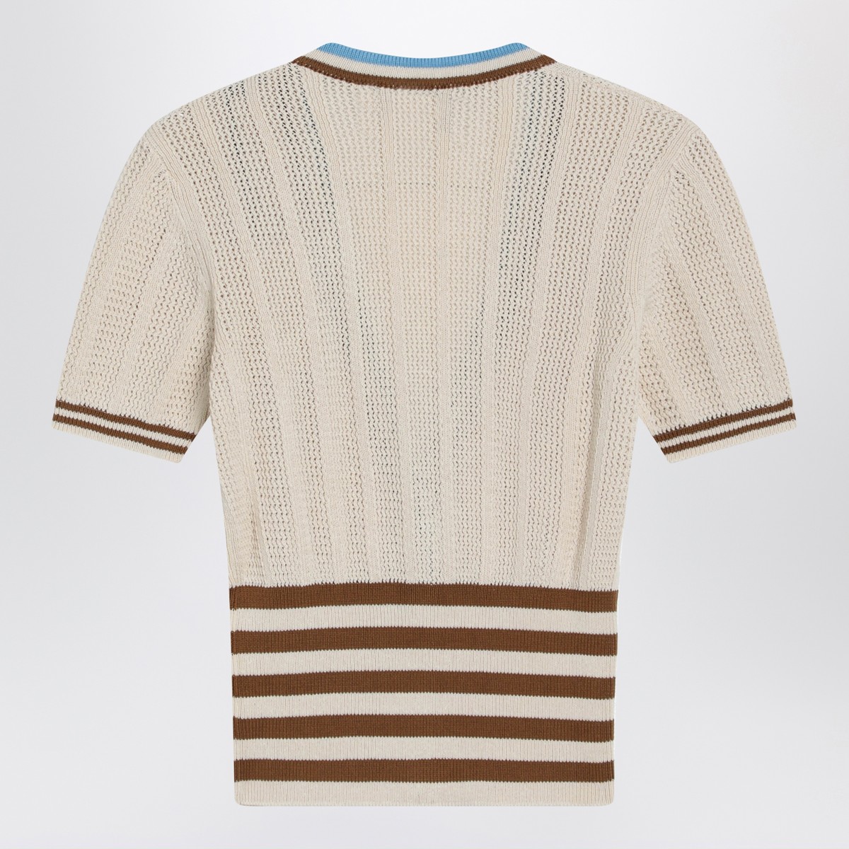 Valentino Garavani short-sleeve cardigan in ivory open-knit cotton, featuring contrasting stripe details, front button closure and Vlogo Signature metal detail with gold-tone finish on the front.