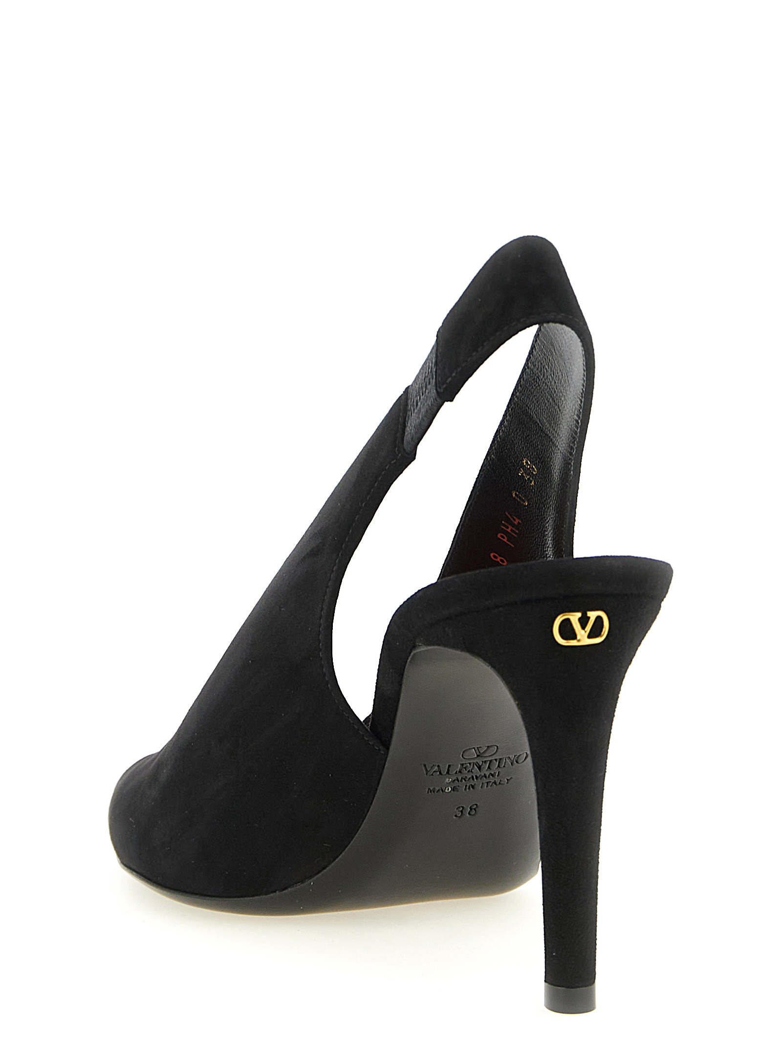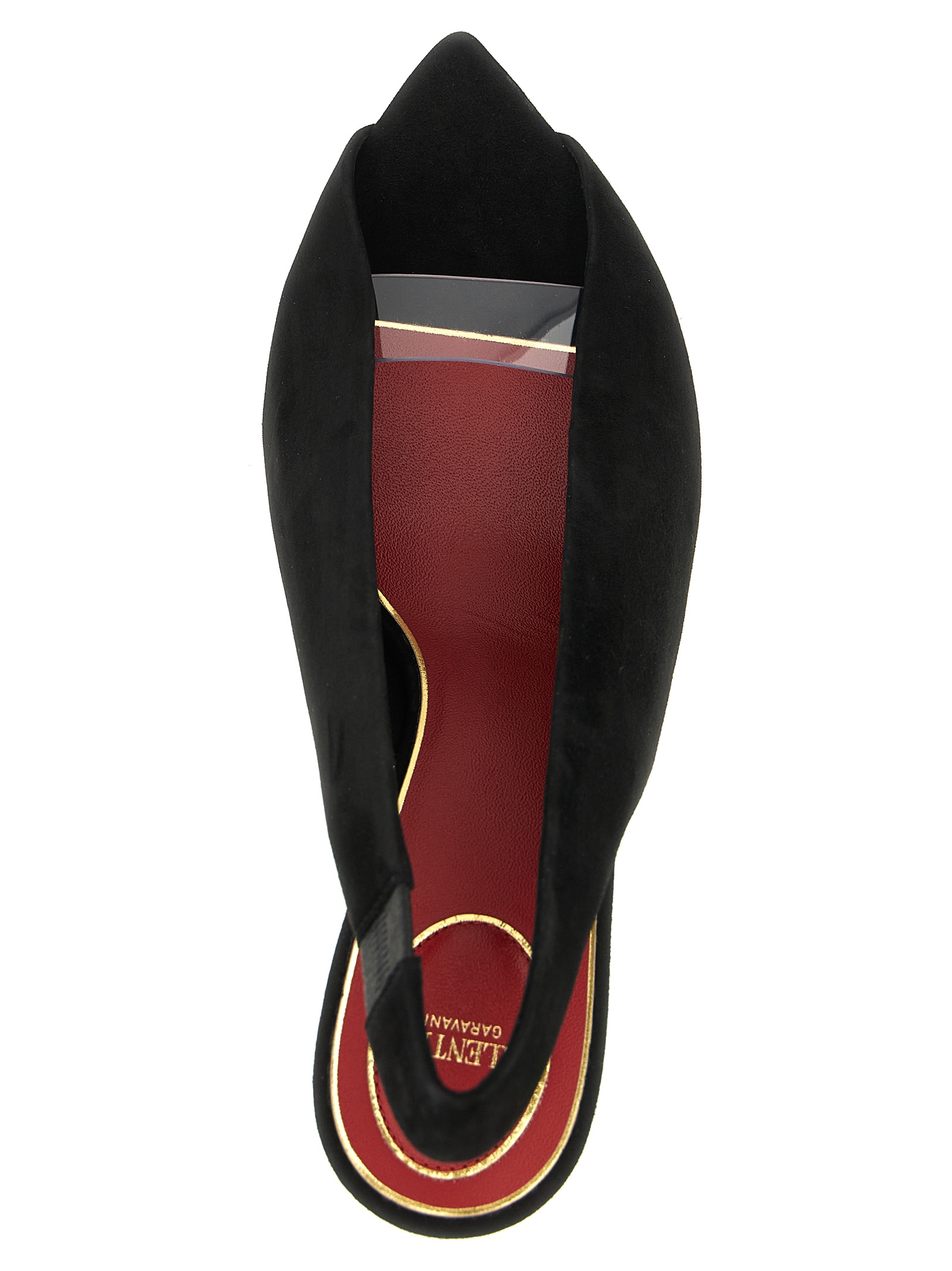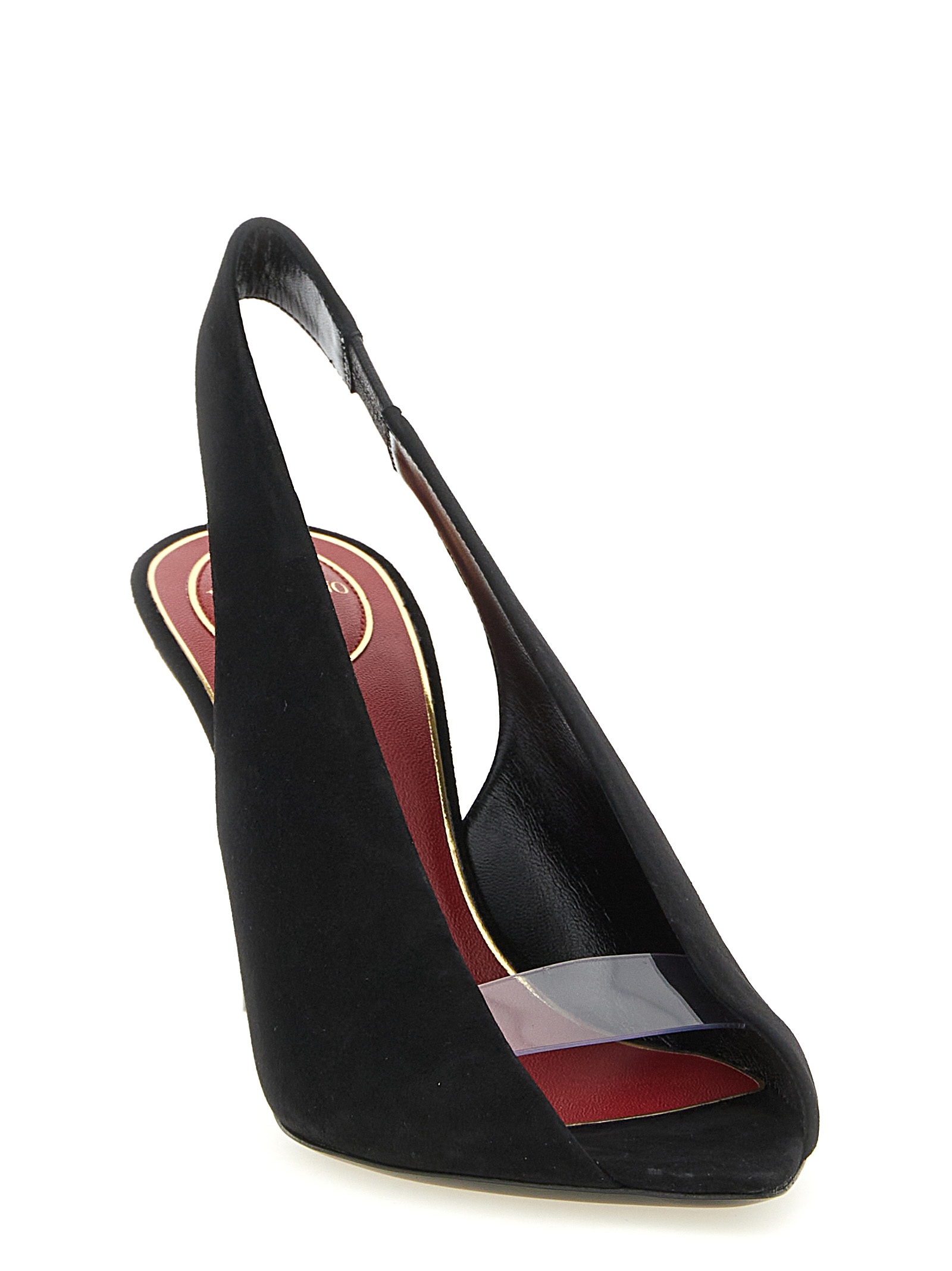 ‘révélé’ suede slingbacks, Open-toe pointed model with transparent polymer material band, Heel with antiqued brass finish metal ‘vlogo signature’ applied, Leather sole. Size and Fit – Eu woman – heels: 8,5 cm