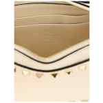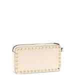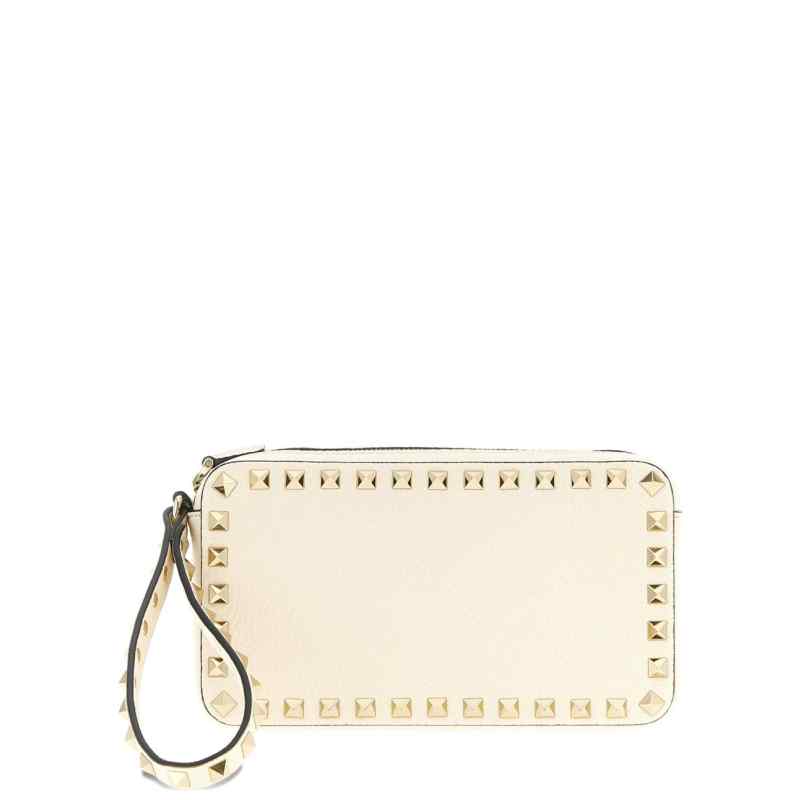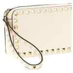 cream stud appliqué top zip closure wrist handle Rockstud leather mini bag. Size and Fit – WIDTH 19 cm. HEIGHT 10,5 cm. DEPTH 4 cm.