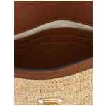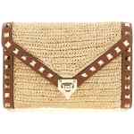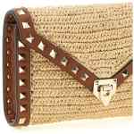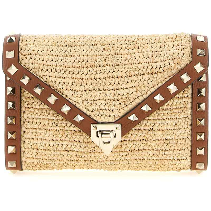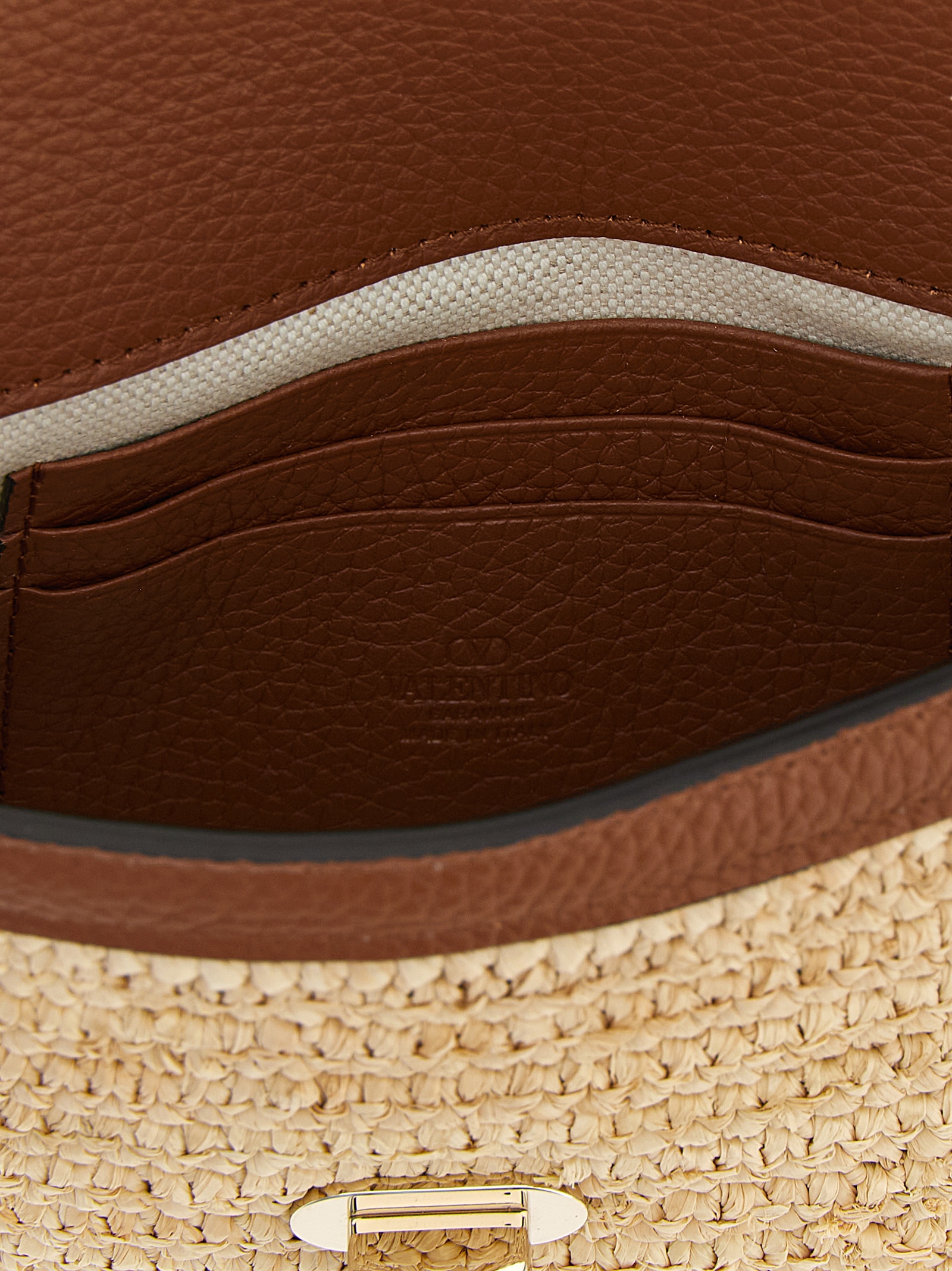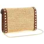 ‘rockstud’ mini crossbody bag in woven natural raffia with hammered leather details and platinum-finish metal studs, Flap closure with hook, Nappa lining, And removable chain shoulder strap.