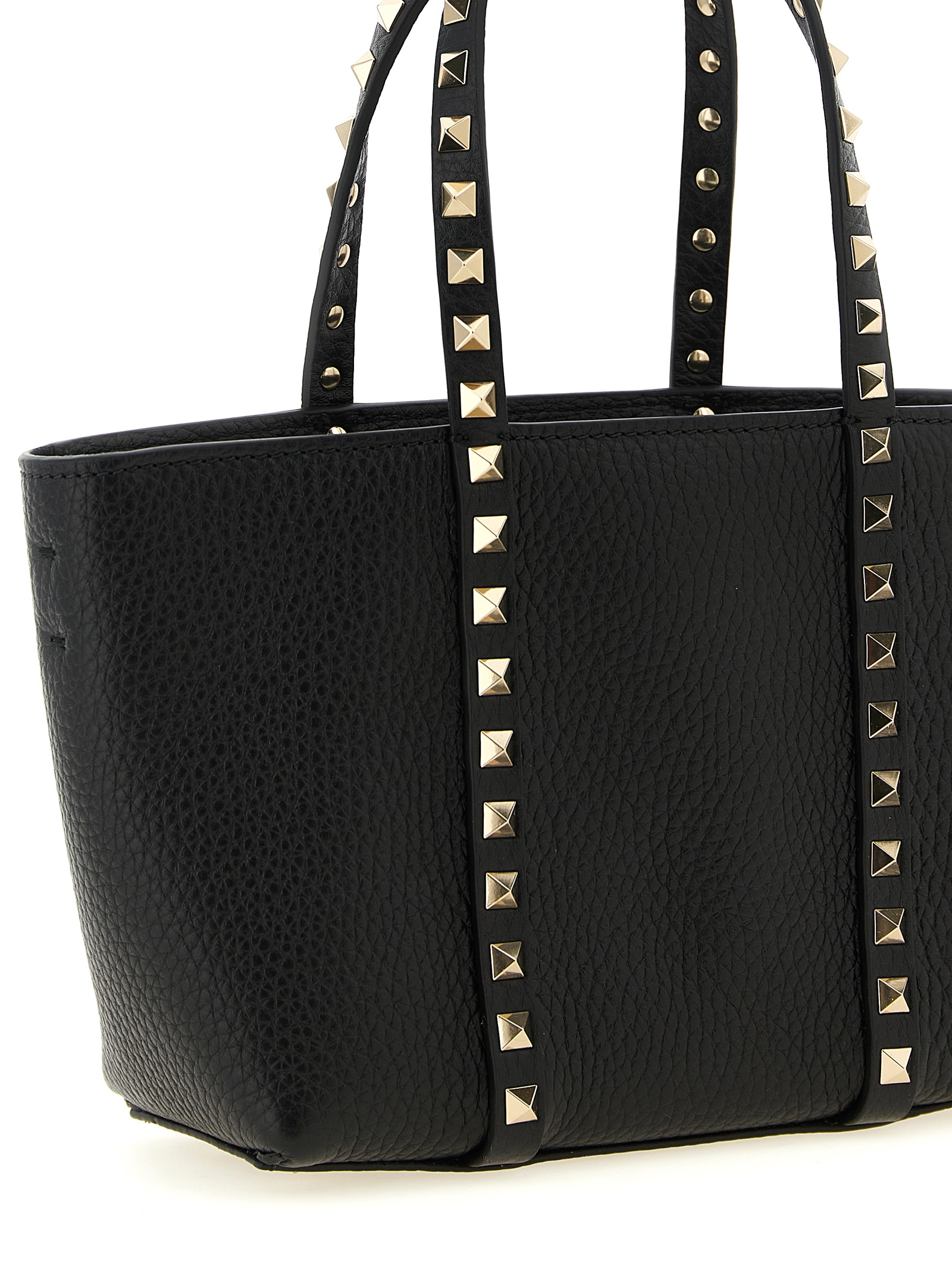 ‘rockstud’ mini hammered leather shopping bag with metal stud application, Double fixed handle, Upper inner zip closure, Rigid base with metal feet, Nappa lining, Adjustable and removable shoulder strap.