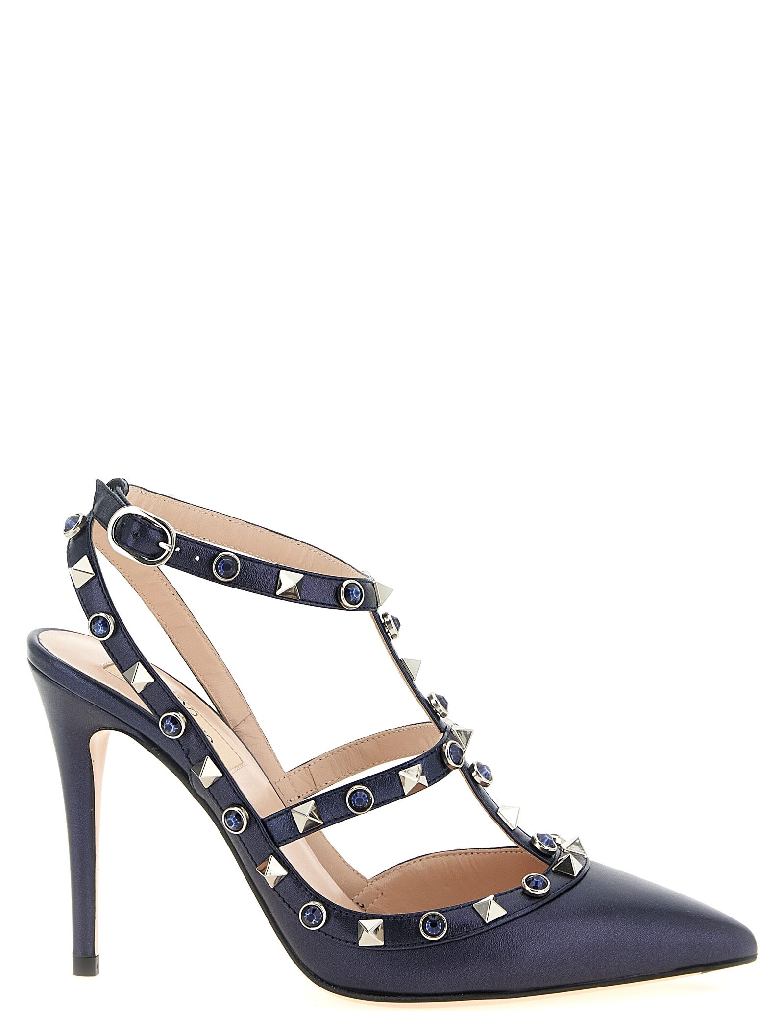 ‘rockstud’ pumps in laminated nappa leather with tone-on-tone cabochon application and palladium-finish studs, Pointed model, Adjustable ankle straps, Stiletto heel, Leather sole.