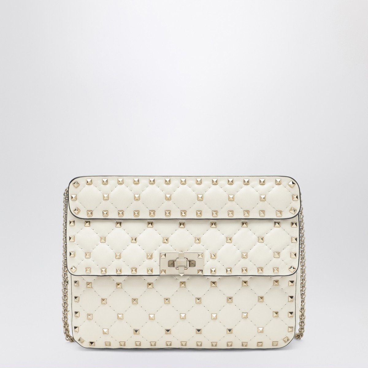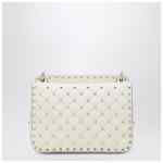 Valentino Garavani medium ivory lambskin nappa bag, featuring quilted workmanship with small studs, Rockstud Spike chain shoulder strap, removable top handle, platinum-finish studs and hardware, flap with turn-lock closure, and interior red leather zip pocket.