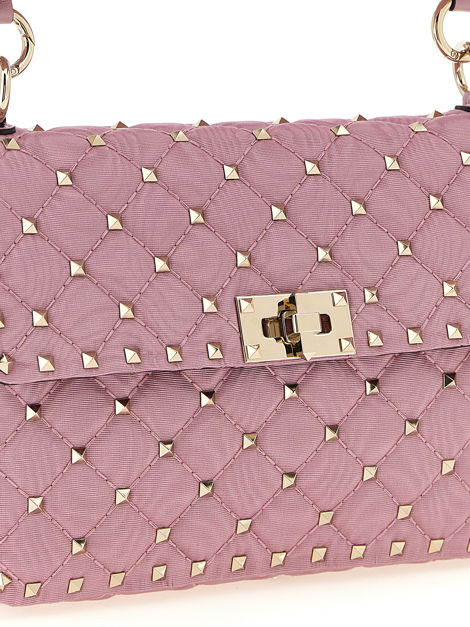‘rockstud spike’ shoulder bag in quilted moiré fabric with all-over stud appliqué, Flap closure with swivel, Removable handle, Removable chain shoulder strap. Size and Fit – W 24 x h 16 x d 7 cm