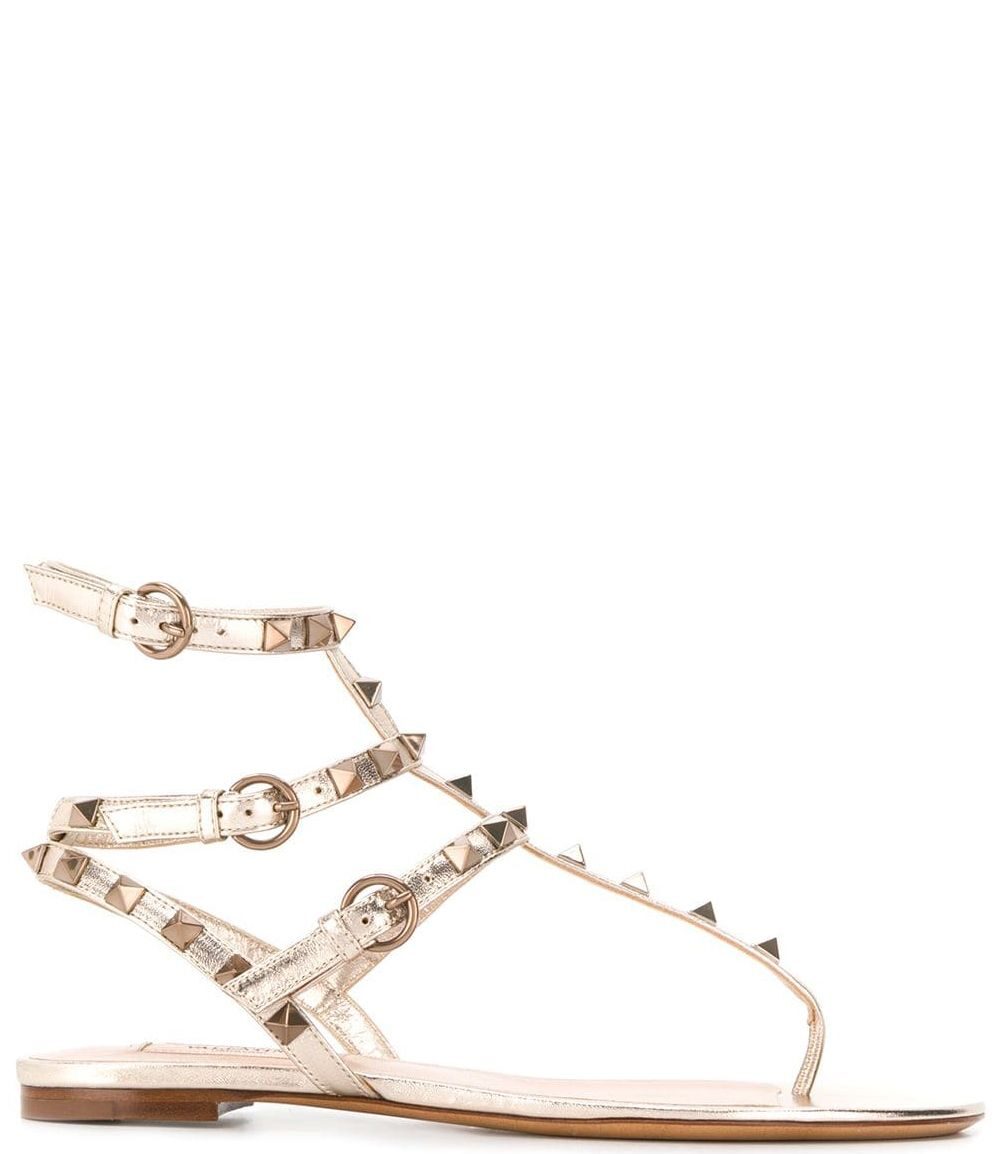 beige nappa leather gold-tone Rockstud embellishment caged design laminated finish side buckle fastening adjustable straps open toe branded leather insole flat sole Rockstud leather thongs