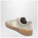 Valentino Garavani low-top sneaker in beige and cream suede leather, featuring lace-up closure, embossed logo on the side, and rubber sole.