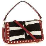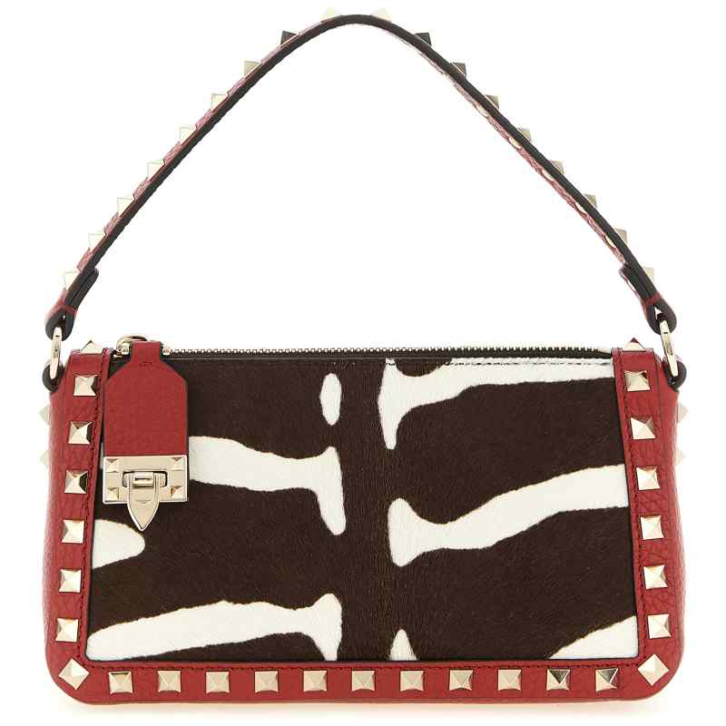 Small ‘rockstud’ shoulder bag in calf leather with elk effect print on the front and back in pony-effect leather with ‘fauve Éclat’ print and stud appliqué, Fixed short handle, Top zip closure with iconic hook closure to lock the zip puller, And removable long handle. Size and Fit – W 19 x h 13 x d 7 cm