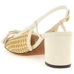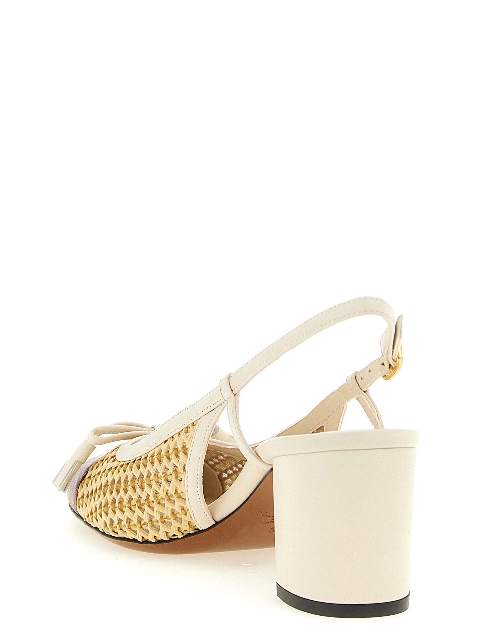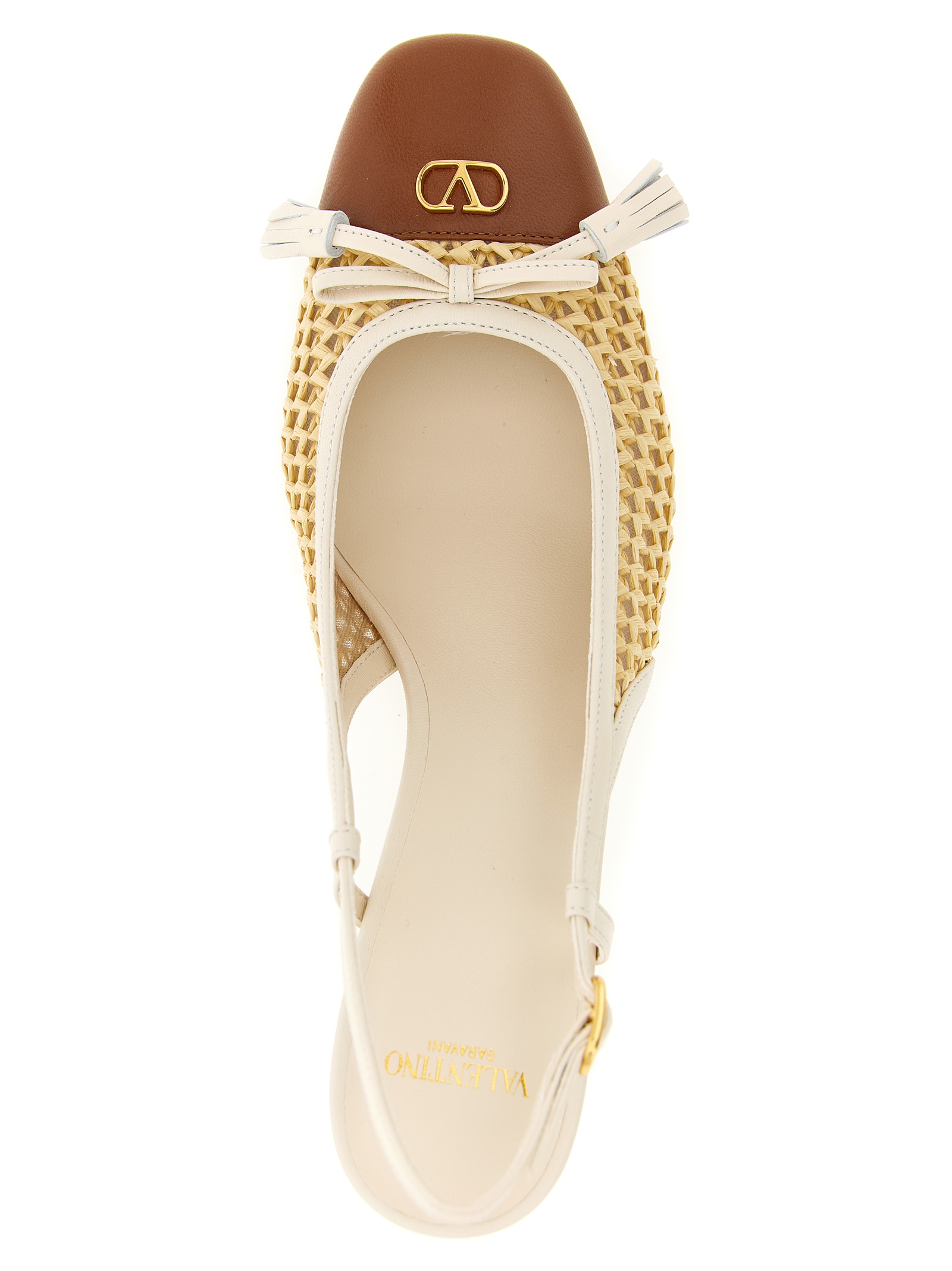 ‘valet du roi’ mesh slingbacks covered with woven raffia and kid leather, Square toe contrast with antiqued metallic ‘vlogo signature’ and bow with front tassels, Adjustable strap, Wide heel, Leather sole.