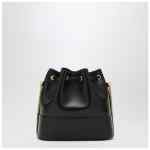 Black leather Valentino Garavani bucket bag featuring metallic Vlogo front detail, culisse closure, chain shoulder strap, gold-tone metal hardware and tone-on-tone leather interior.