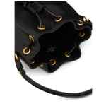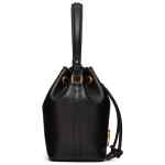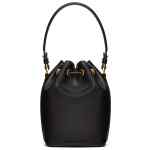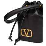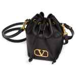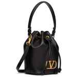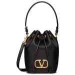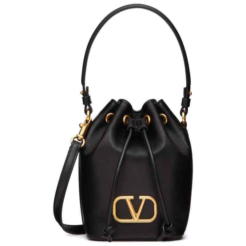 black calf leather smooth grain VLogo Signature drawstring fastening single top handle detachable shoulder strap main compartment debossed internal logo leather lining gold-tone hardware This piece comes complete with a protective dust bag. Vlogo mini bucket bag. Size and Fit – . DEPTH 10 cm. HEIGHT 18 cm. WIDTH 12 cm.