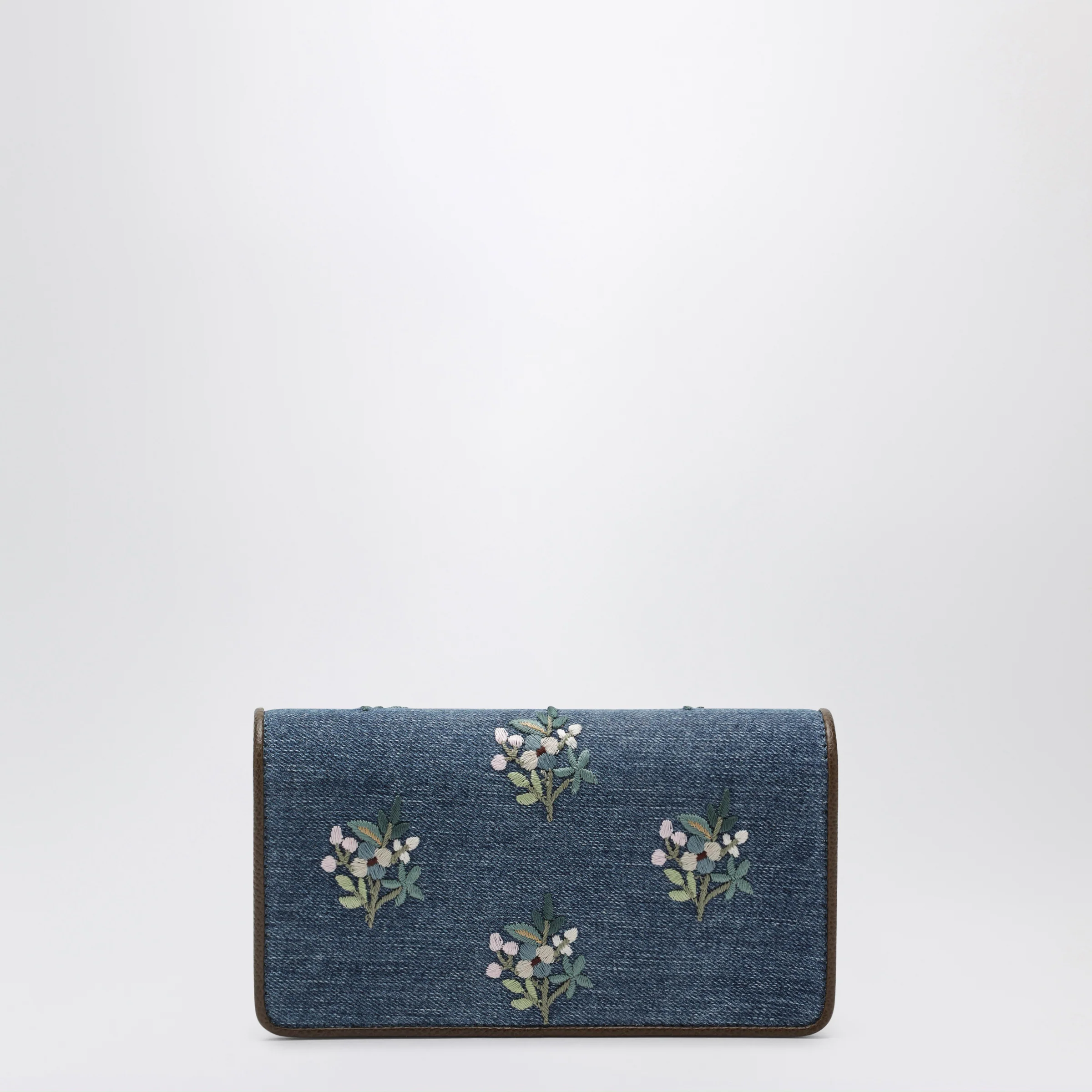 Valentino Garavani mini crossbody bag in denim Color Denim Multicolor Tobacco Floral embroidery motif Leather trims Chain shoulder strap Magnetic button closure Logo and hardware in antique brass finish Nappa lining Interior one zip pocket and one card slot compartment. Size and Fit – Width 20 cm x Height 10,5 cm x Depth 5 cm Shoulder strap length 100 cm