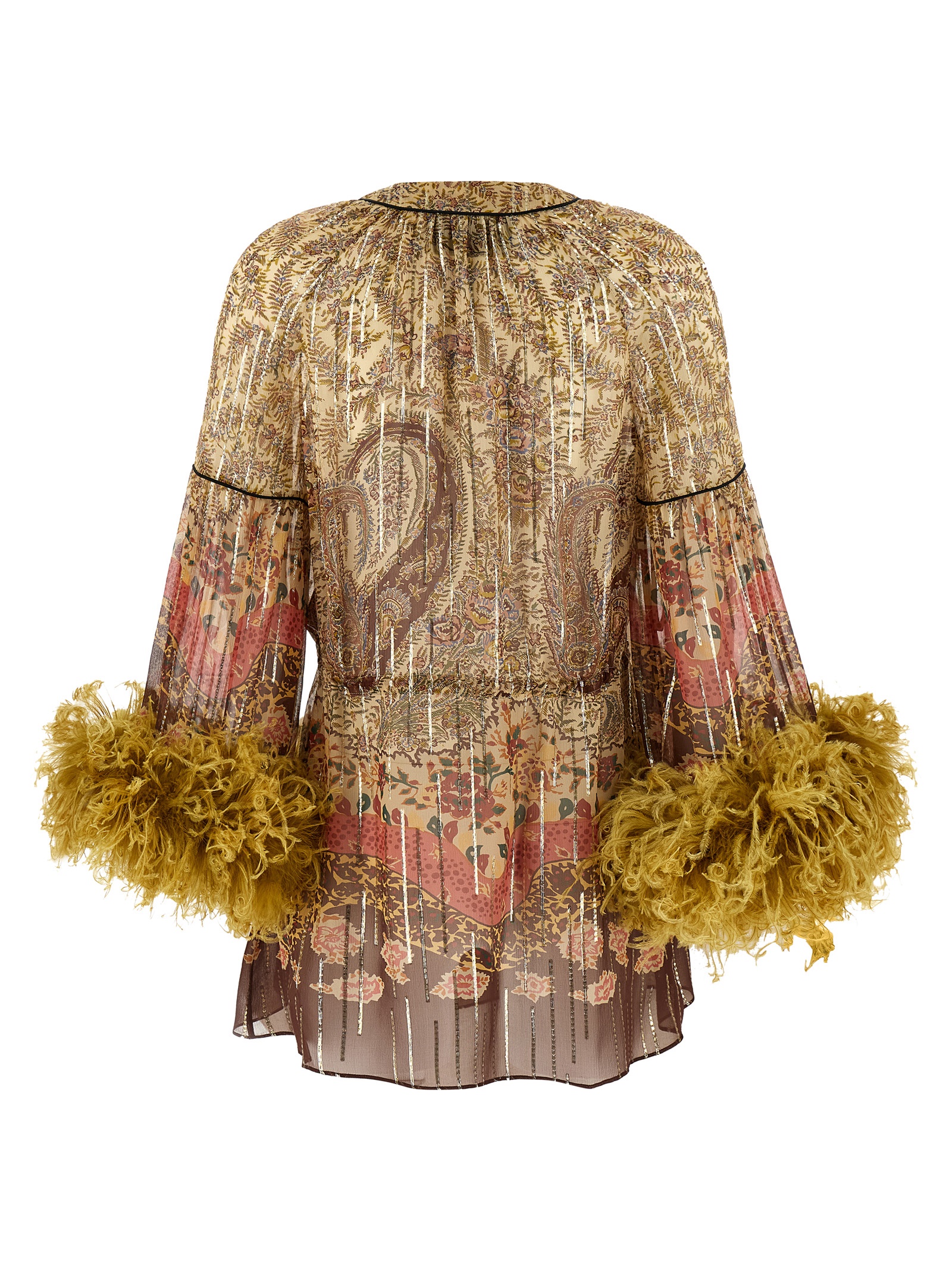 Pekin ‘voyage imaginaire paisley’ print silk top with lamé thread, Drawstring with tassels to tie around the neck and waist, Flared long sleeves with dropped shoulders and ruffled feather boa on the sleeve hem. Size and Fit – true to size fit