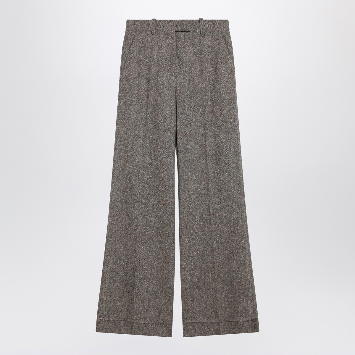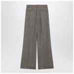 Valentino palazzo trousers in ivory and brown patterned virgin wool, featuring belt loops, front zip, button and hook closure, two side pockets, two back pockets, and pressed pleats front and back.