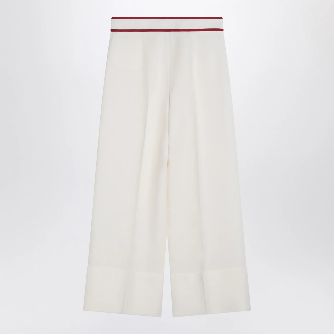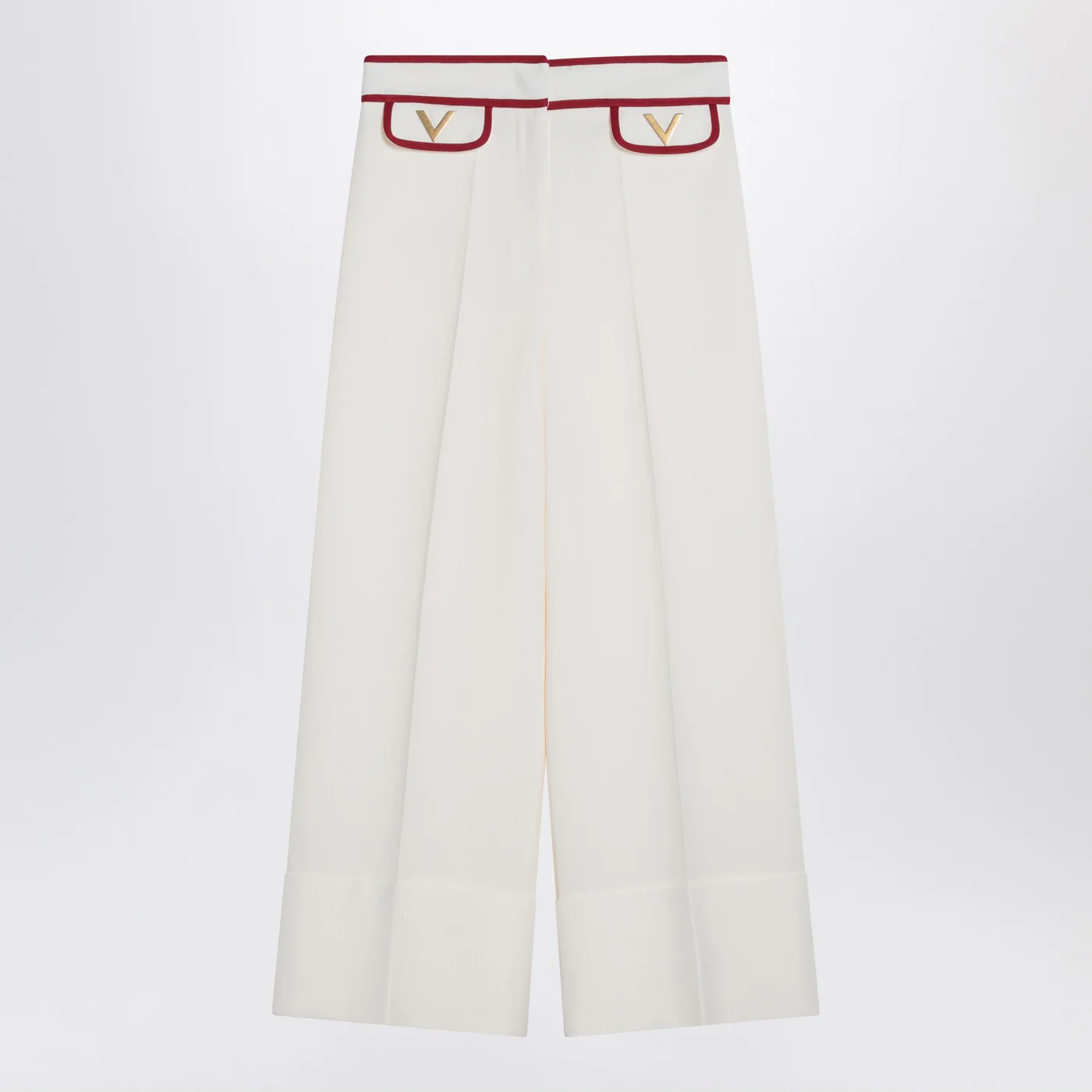 Valentino pants in virgin wool and ivory silk, characterized by a zip closure and hook, red edges, front detail with V Gold, cuff at the bottom of the leg and pleat at the front.
