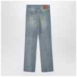 Light blue washed cotton denim jeans by Valentino, featuring front zip and button closure, belt loops, five classic pockets, and back logo patch.