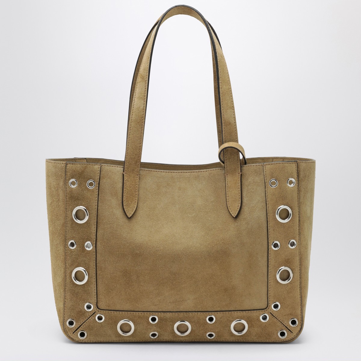 Valentino Garavani medium shopping bag in Havana suede, trimmed with palladium-finish metal sphere studs, featuring two handles, metal VLogo Signature detail and removable internal zip pouch.
