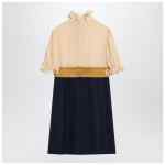 Mini dress by Valentino in beige and blue silk and viscose crêpe, characterized by ruffle details, bow at the waist in the front, short sleeves with elastic trim, front buttons, and a back zip closure.