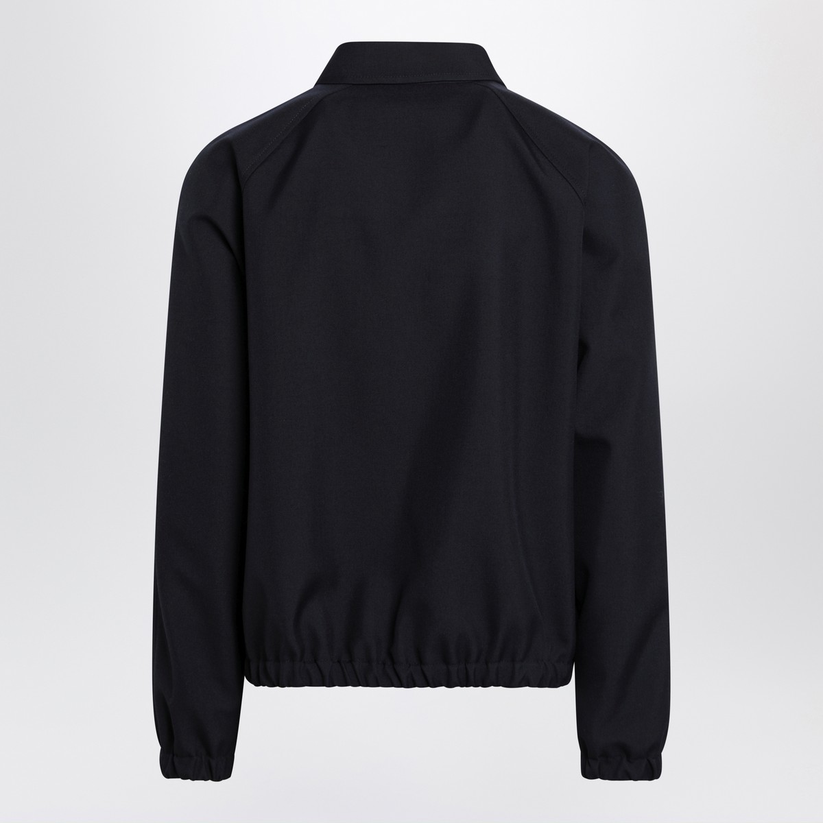 Bomber jacket by Valentino in navy wool blend, featuring front zip closure, long sleeves, elasticated trims, two pockets with Vgold detail, and classic collar.
