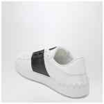 Valentino Garavani white calfskin sneakers, featuring a contrasting colour band, rounded toe, lace-up closure, decorative studs and rubber sole.