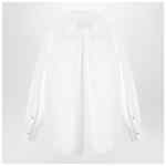 Valentino shirt in white cotton poplin, characterized by a pointed collar, long sleeves with buttoned cuffs, a ruffle detail on the front, a curved hem, and a front button closure.