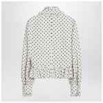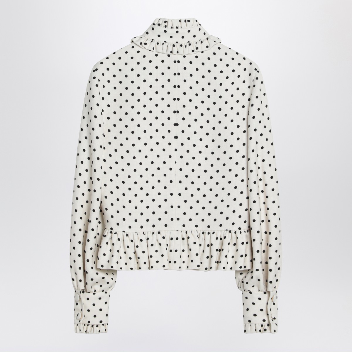 Valentino jacket in white viscose with black polka dots all over, characterized by front buttoning, raised collar with pleated edge, long sleeves with buttoned cuffs, padded shoulders, and hem with ruffle.