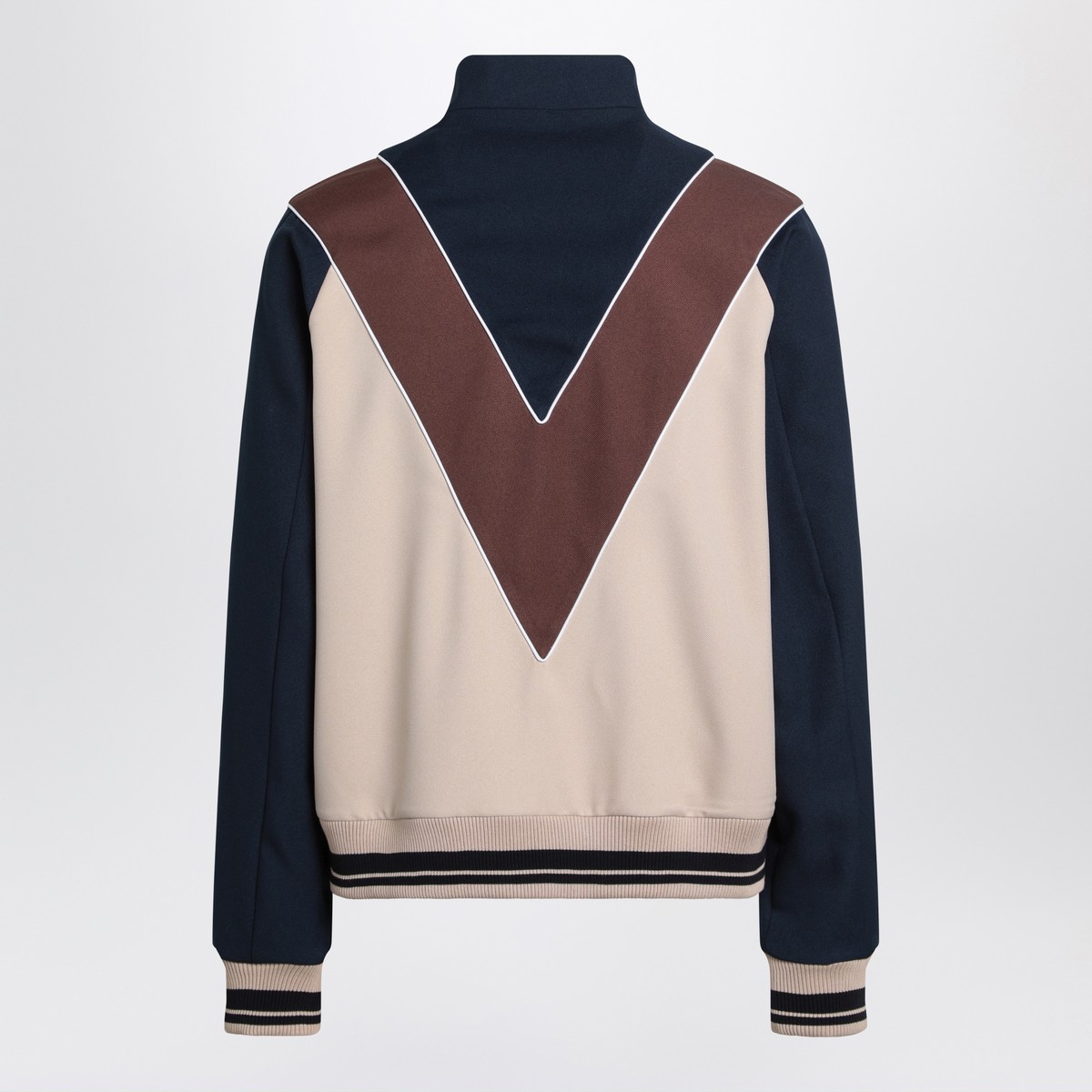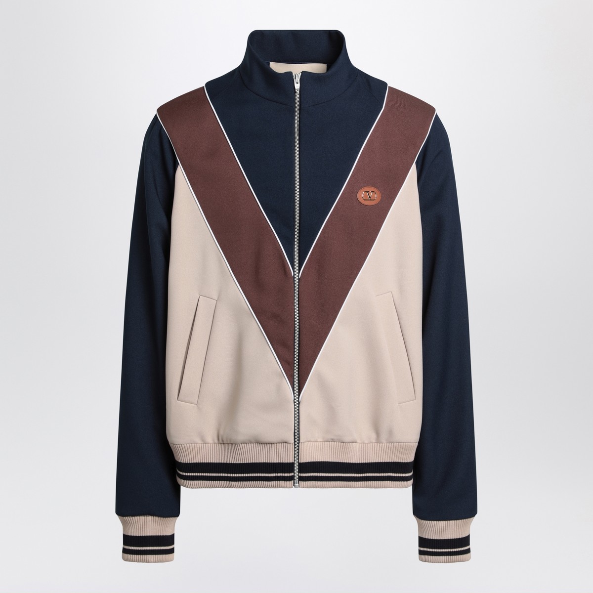 Valentino nylon sweatshirt with a colour-block design in blue, beige, and brown, featuring a zip closure, VLogo patch on the chest, elasticated ribbed finishes, two side welt pockets, a high collar, and a regular fit.
