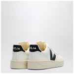 Sneaker by Veja in white organic leather, featuring a perforated round toe, lace-up closure, black leather side V, black heel with logo lettering and rubber sole.