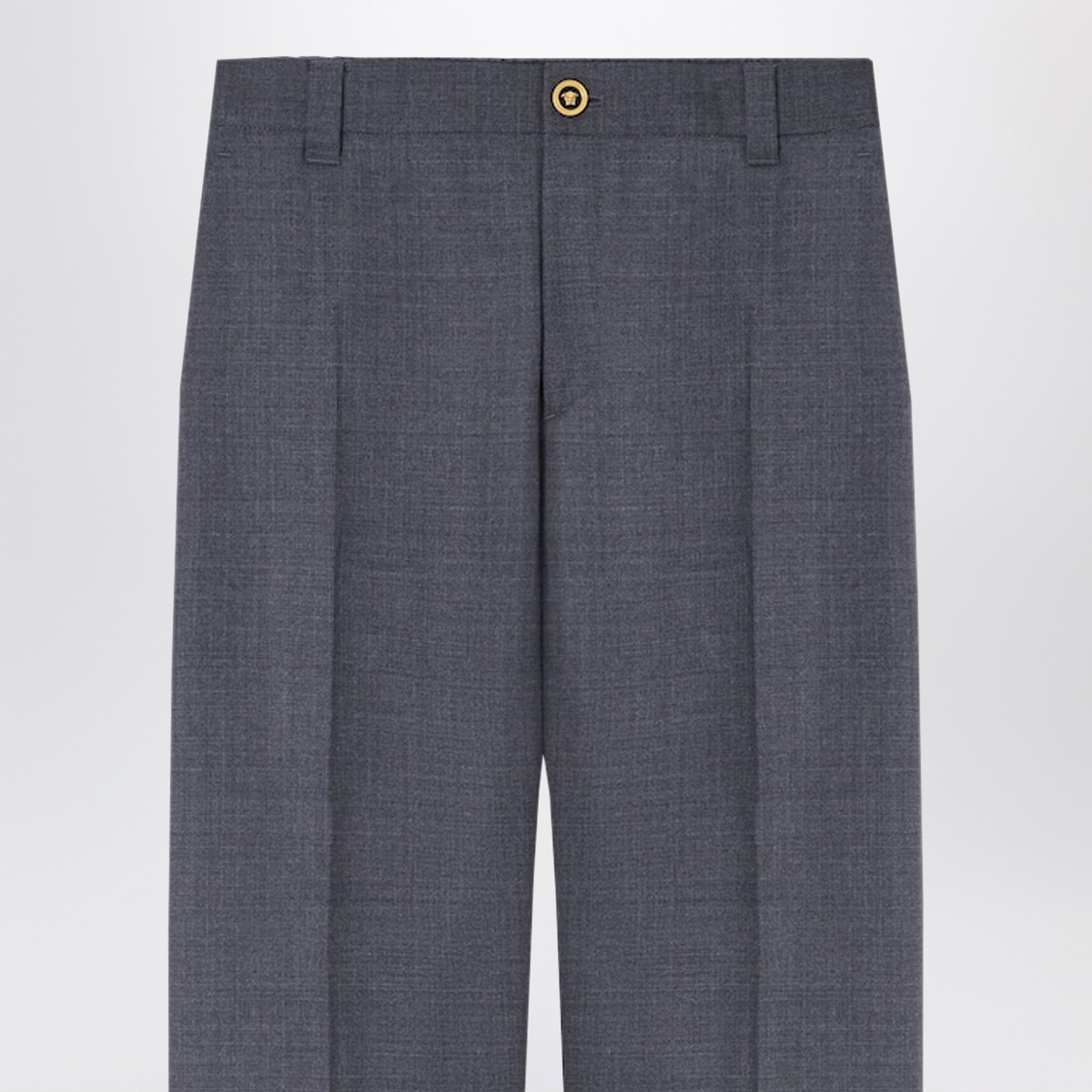 Versace anthracite grey wool trousers with micro-check pattern, straight leg, belt loops, elasticated waist, front zip and button closure, internal button fastening, Medusa button, side pockets, rear welt pockets and logo label.