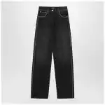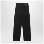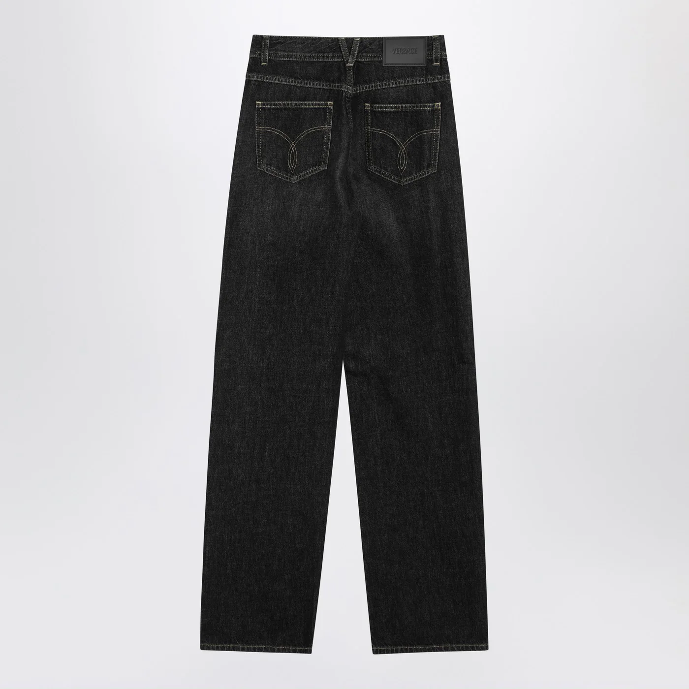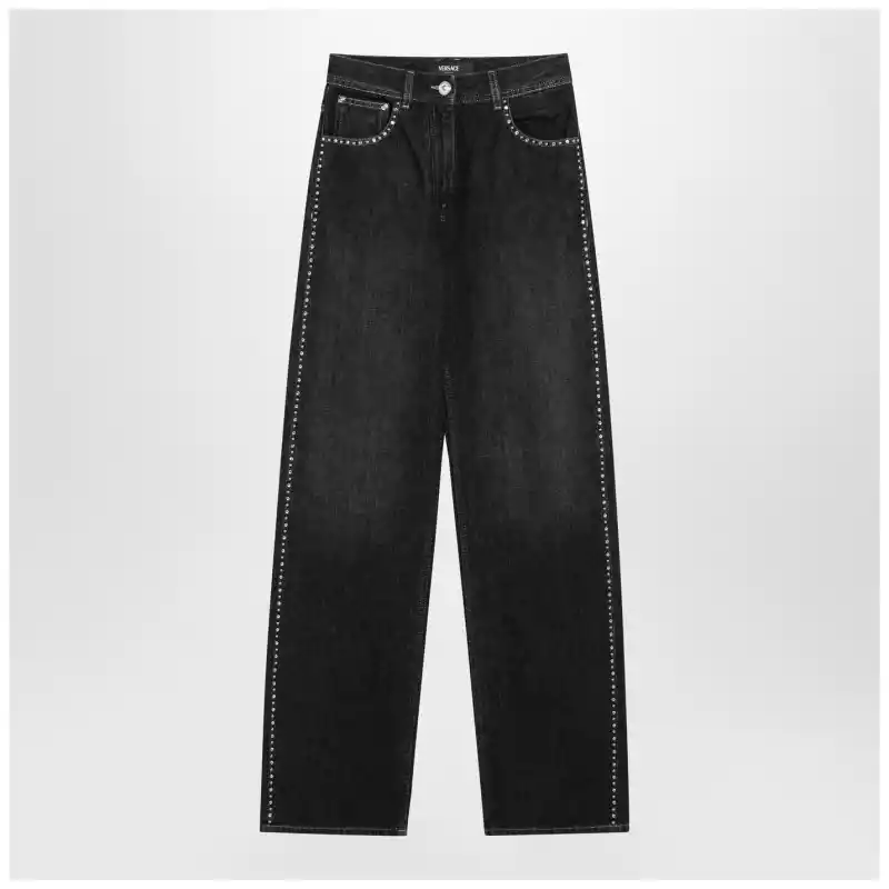 Jeans by Versace in black cotton denim with stone washed finish High waist with belt loops Regular fit Stud details Crystals along the edges Five classic pockets Rear logo patch Front zip and logo button closure. Size and Fit – Model wears size 26 Model measurements: Height: 181 cm Chest: 81 cm Waist: 62 cm Hips: 89 cm