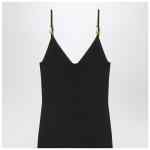 Versace black stretch knit midi dress with ribbed texture, thin straps with Safety Pin hardware, V-neckline and central back slit.