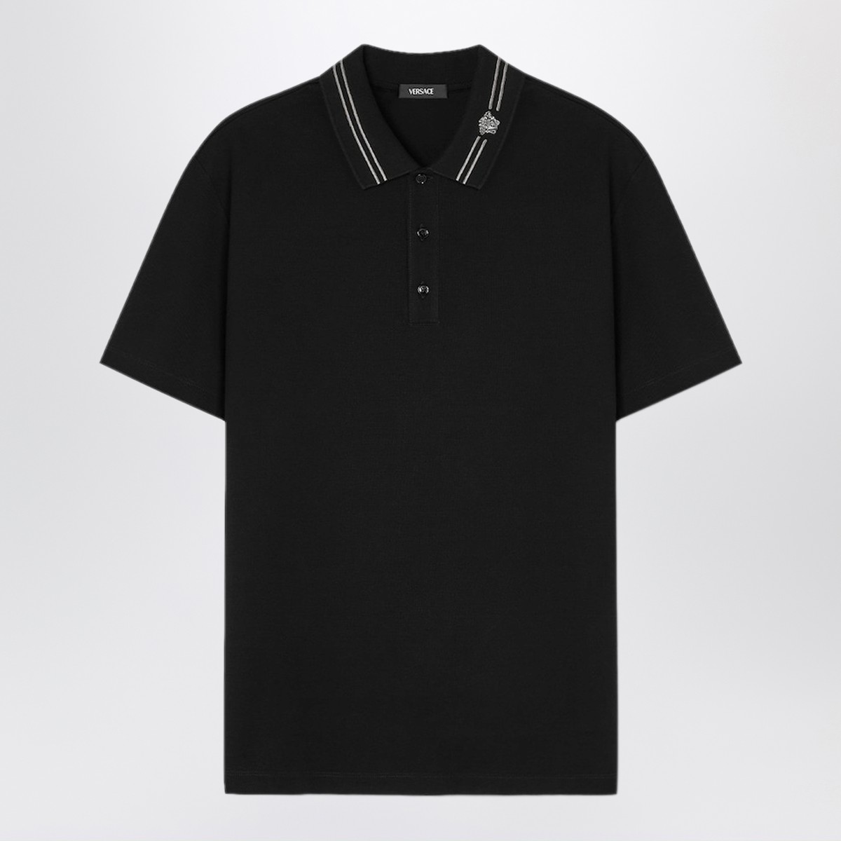 Versace black cotton piqué polo shirt with short sleeves, slim fit and striped collar with Medusa embroidery.