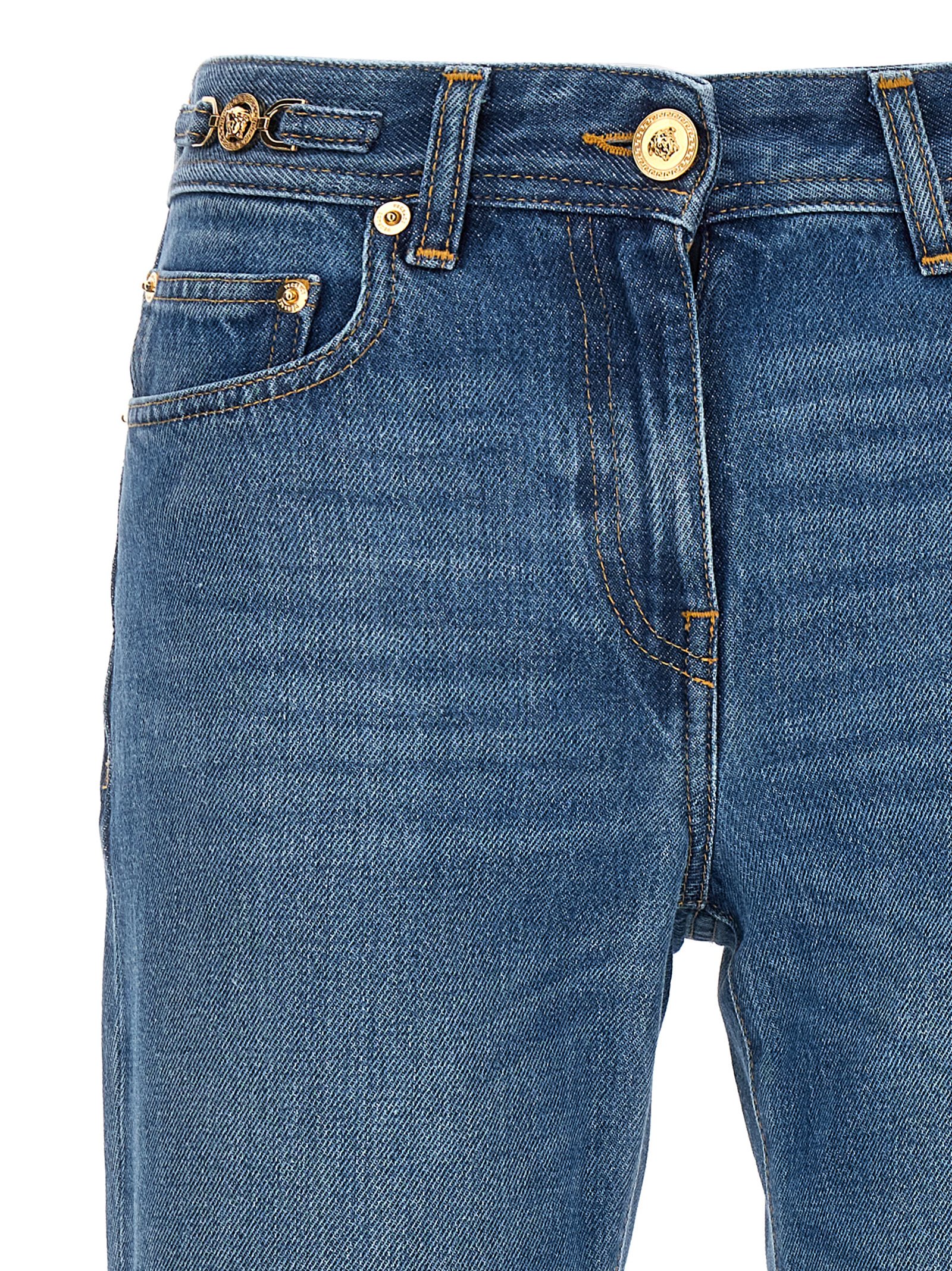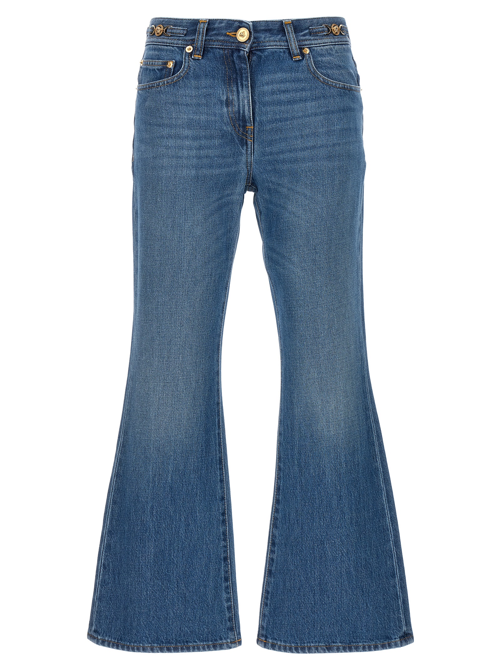 Denim jeans, flared at the ankle. Metallic jellyfish detail at the waist.