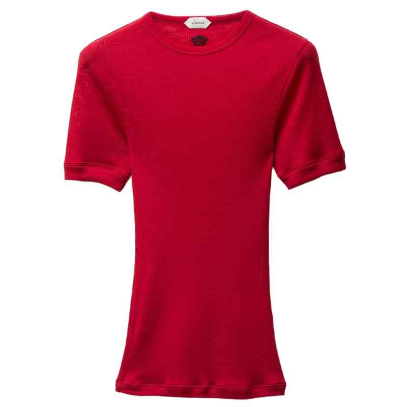 A short-sleeved wool ribbed knit T-shirt featuring a Medusa thread-embroidery at the back. Medusa embroidery short sleeves crewneck The model is 1.75 m tall and wears size 38 IT Wool crewneck sweater.