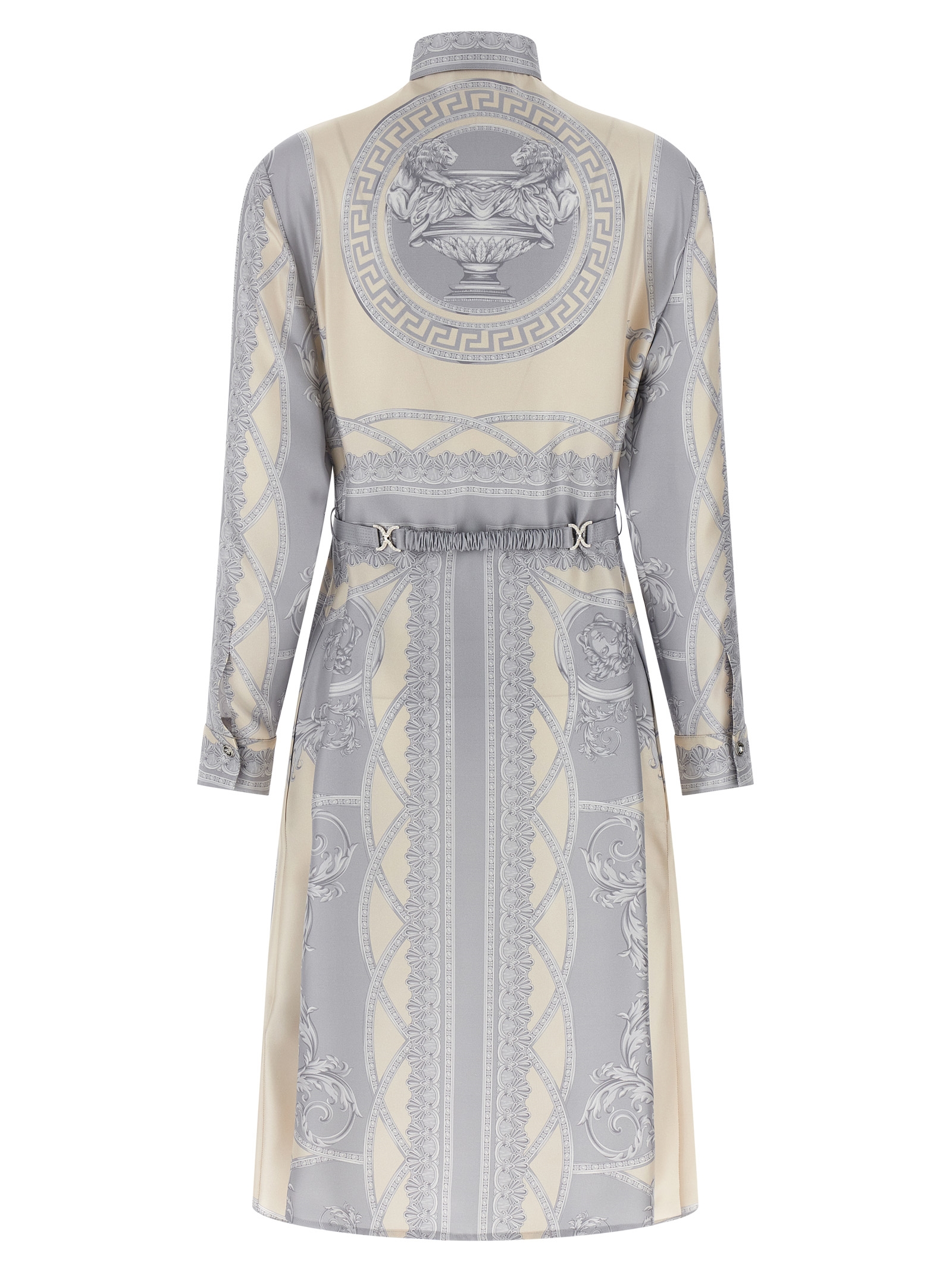 ‘La Coupe des Dieux’ print silk twill dress, chemisier model, button closure, long sleeves with cuffs, pockets, elastic belt with removable metal buckle.