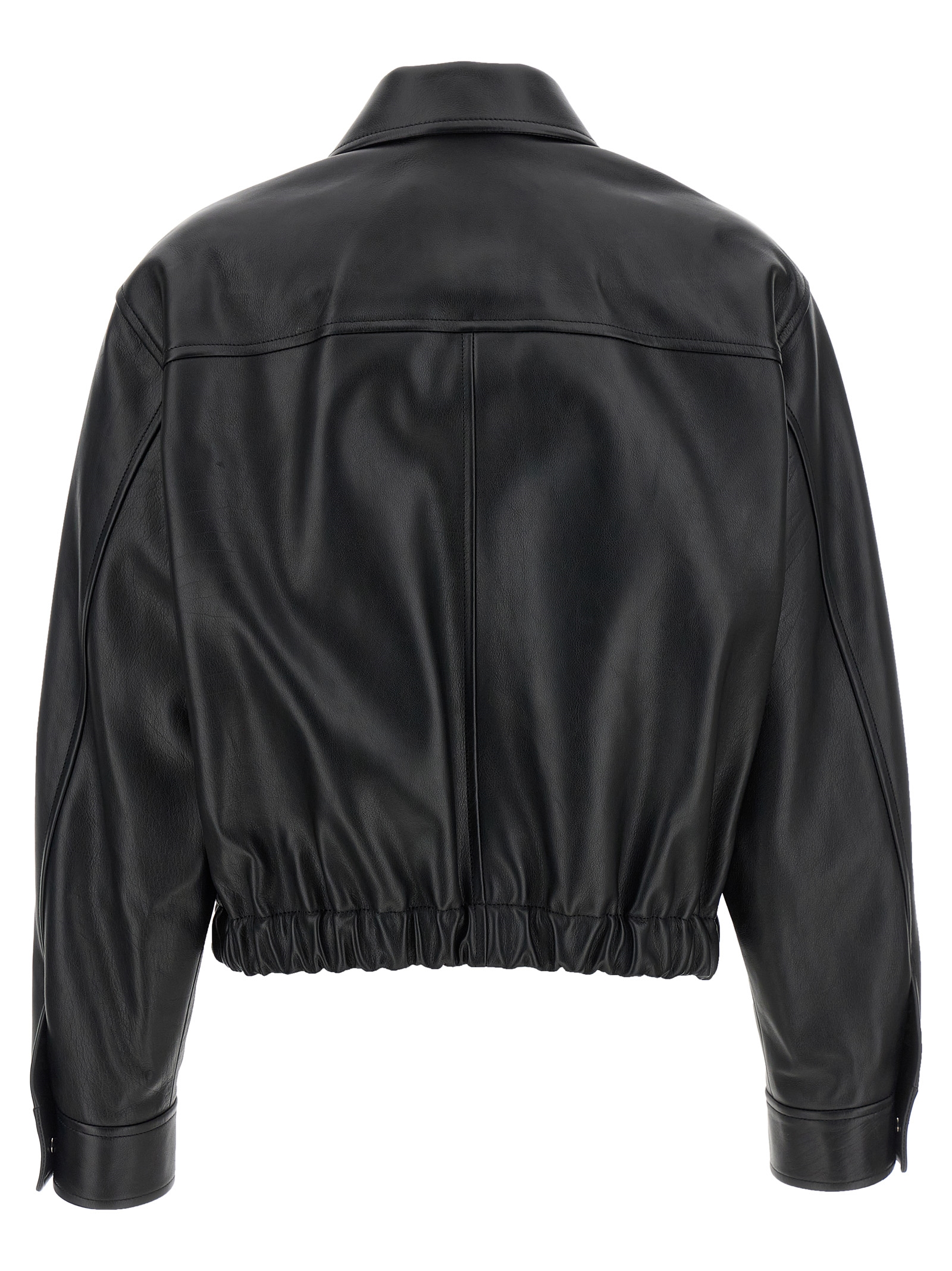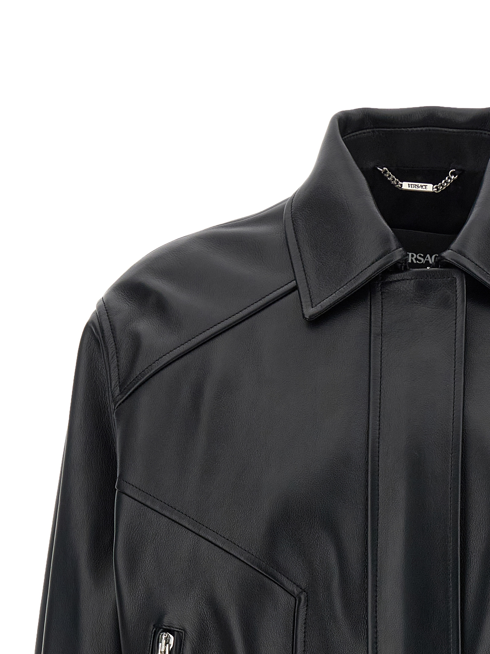 Buffalo leather blouson with shirt collar, Front zip and snap button closure, Pockets, Long cuffed sleeves with ‘medusa’ metal button, Elastic hem, Cupro lining.