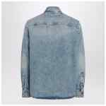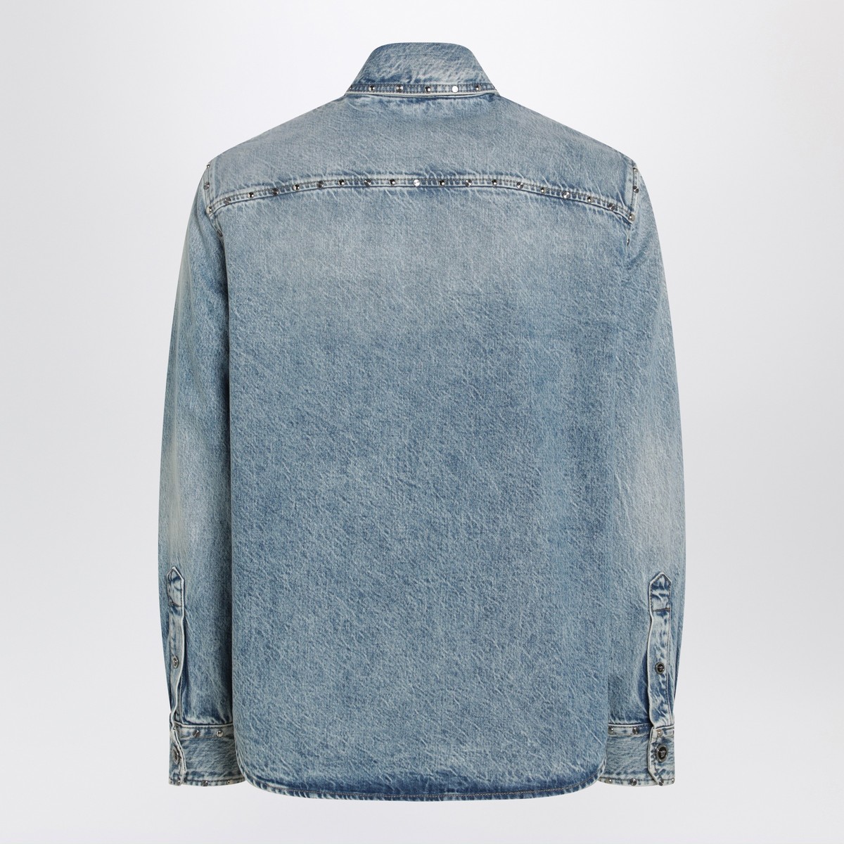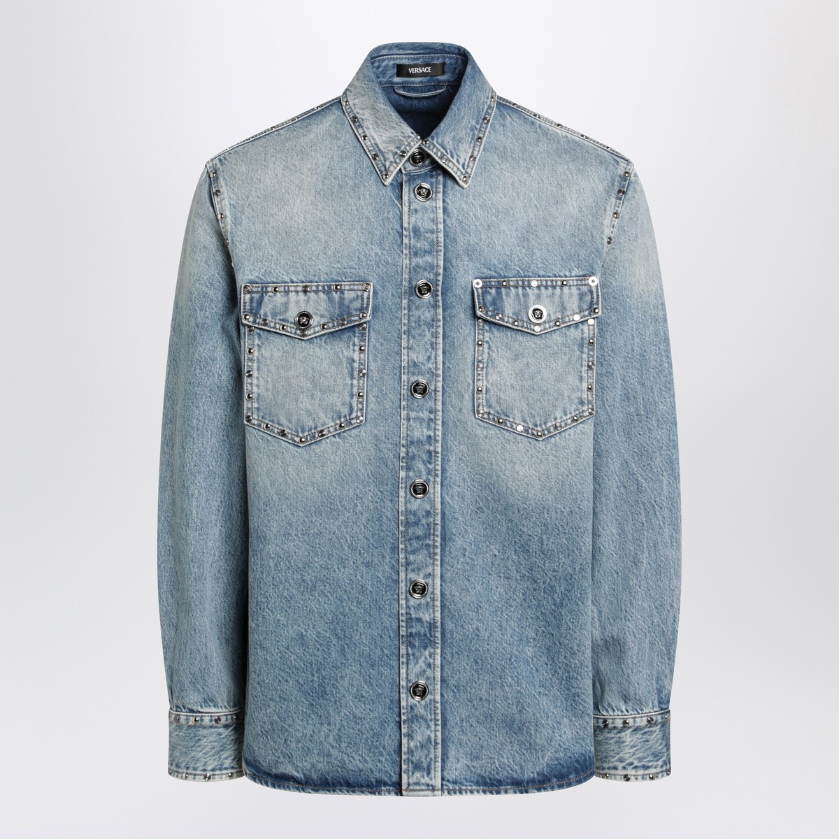 Versace light blue stone-washed denim shirt, featuring long sleeves, buttoned cuffs, stud details and enamelled Medusa snap buttons, pointed collar, snap-button front closure and two front flap pockets.