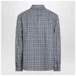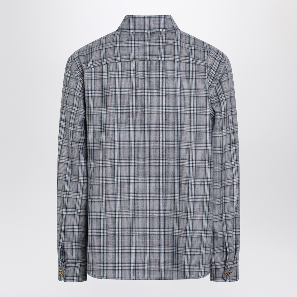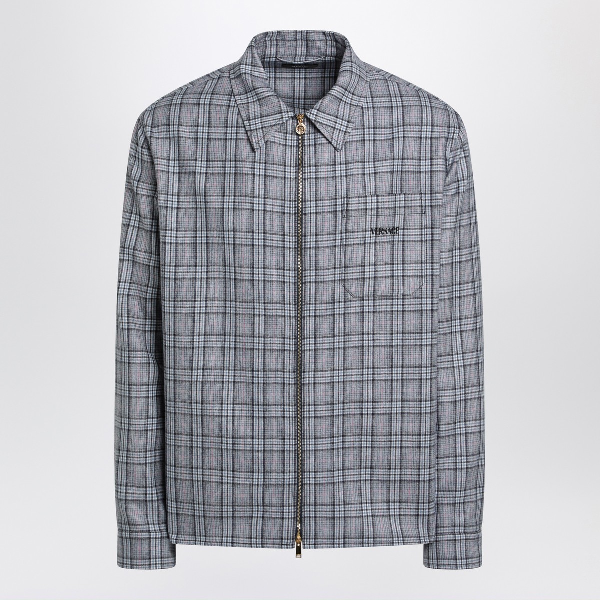 Versace light blue checked wool flannel shirt, featuring front closure with double branded zip, long sleeves with adjustable cuffs with logo button, pointed collar and a chest patch pocket with contrasting embroidered logo lettering.